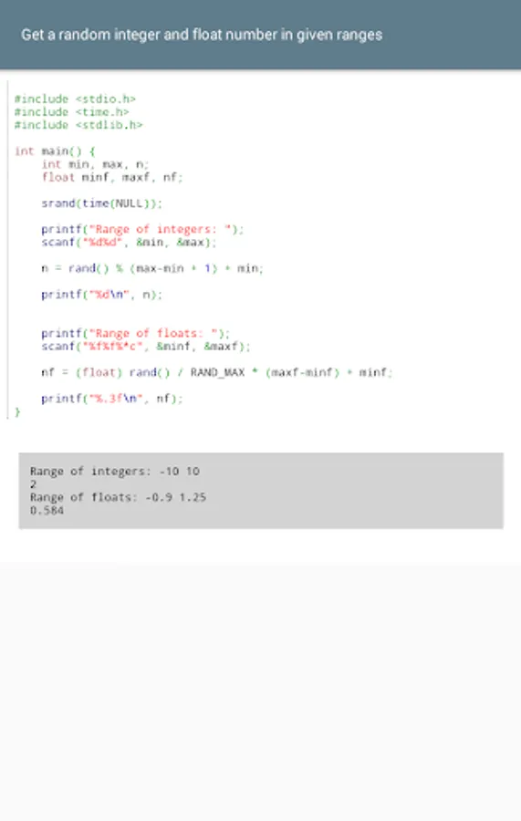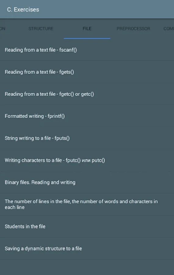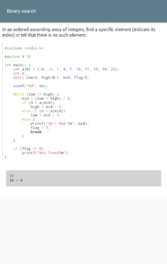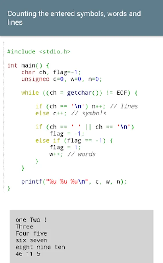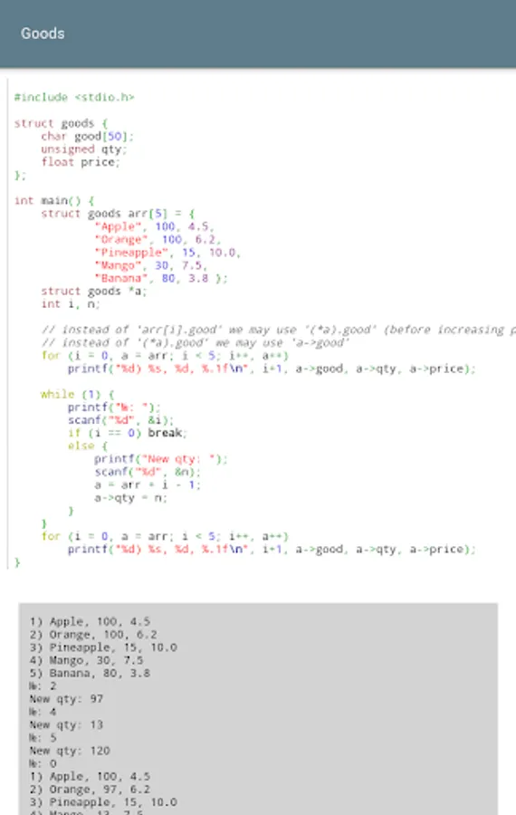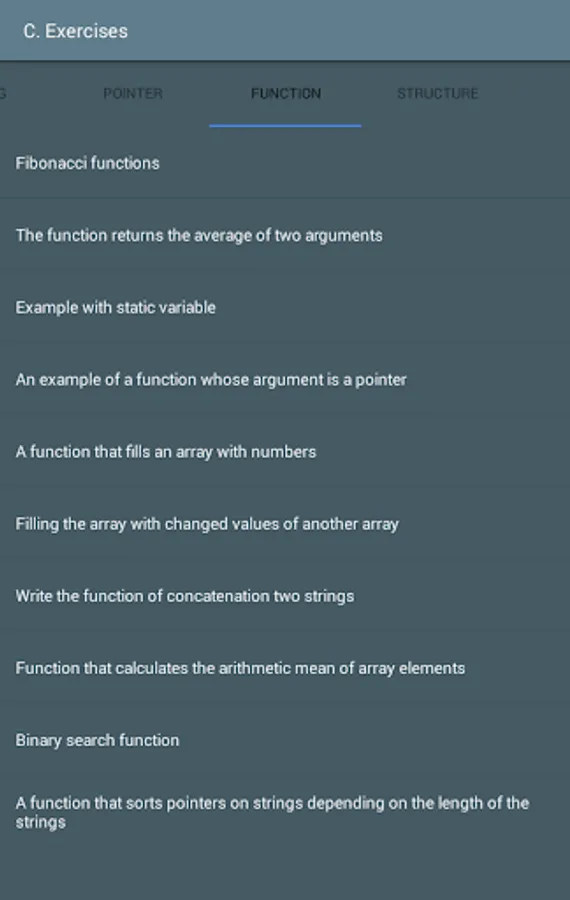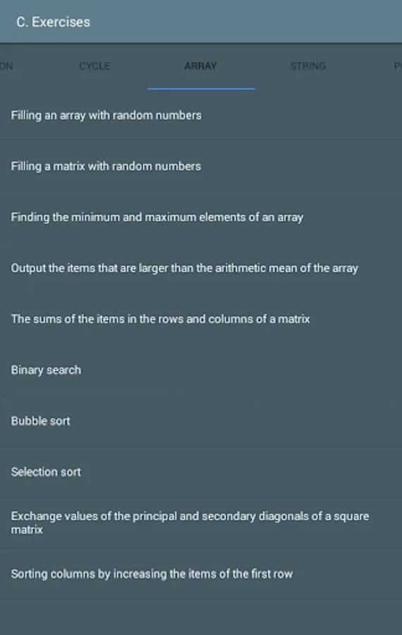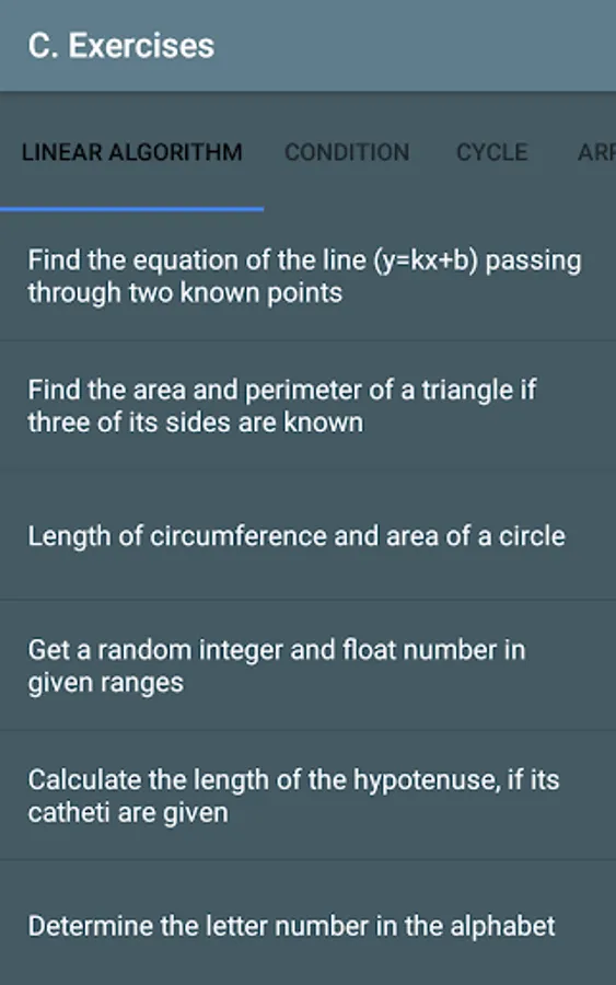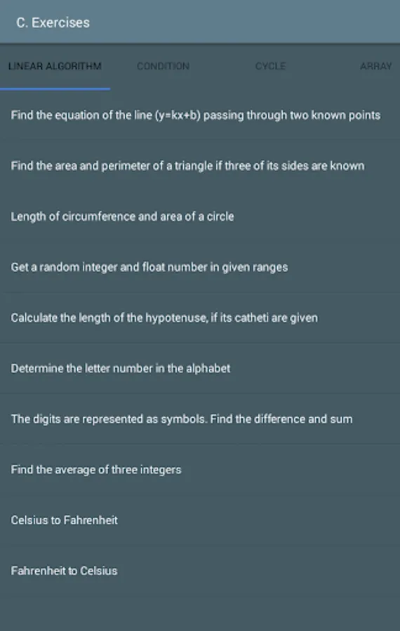 Examples of solving problems in the C programming language. The application includes more than 100 tasks. Eleven topics are considered: linear algorithms, conditions, loops, arrays, strings, pointers, functions, structures, files, the preprocessor and passing arguments to the program.