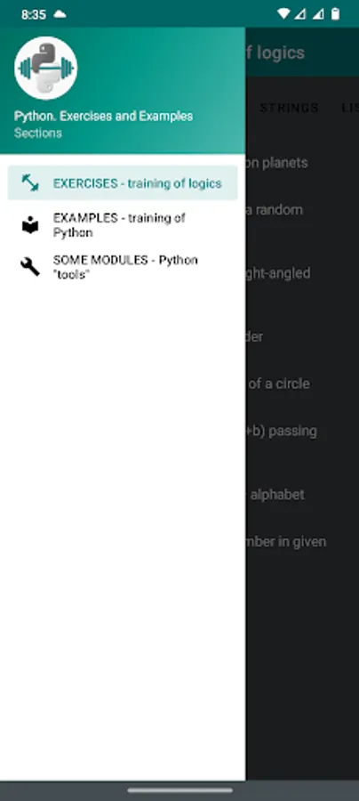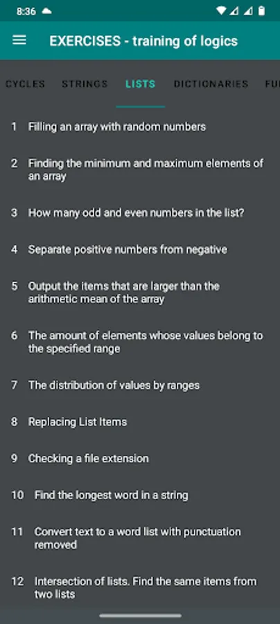 Sections: linear algorithms, conditions, cycles, strings, lists, dictionaries, functions, files.