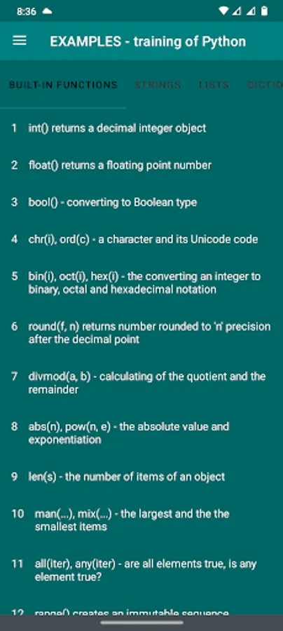 2. Examples of using built-in functions of Python and methods of the base classes - strings, lists, dictionaries, sets, file objects.