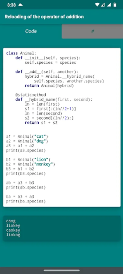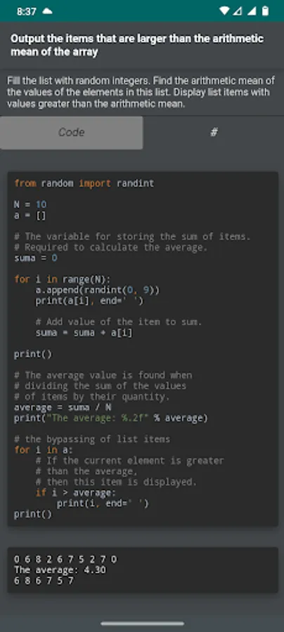 Examples of exception handling, demonstration of the features of object-oriented programming in Python, examples of list comprehension.