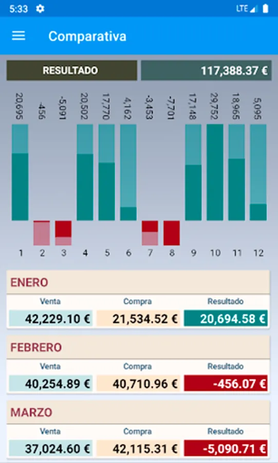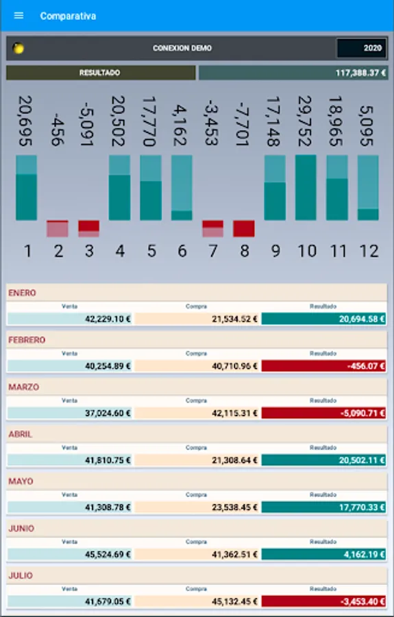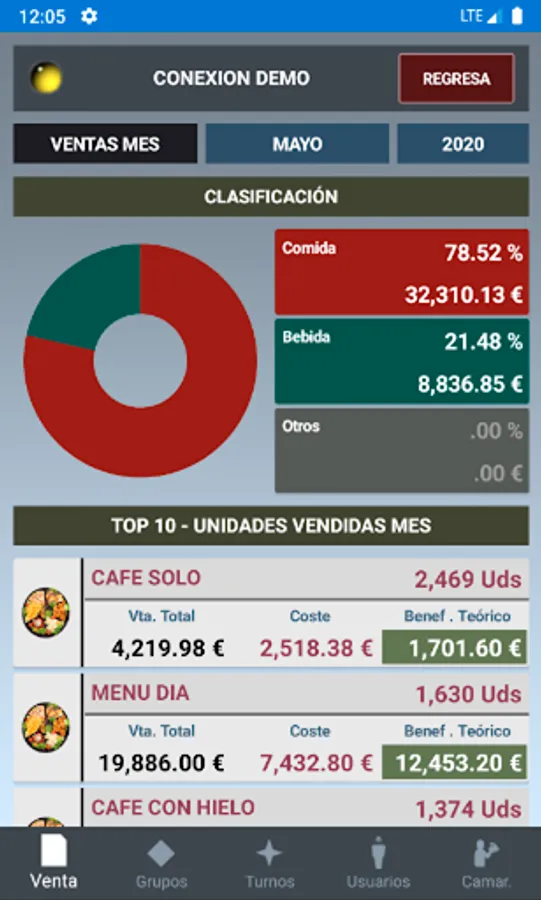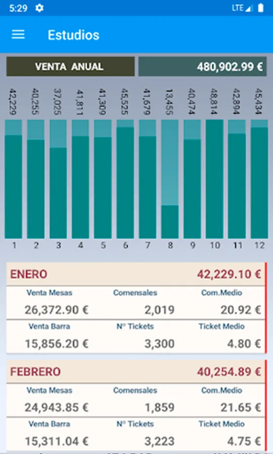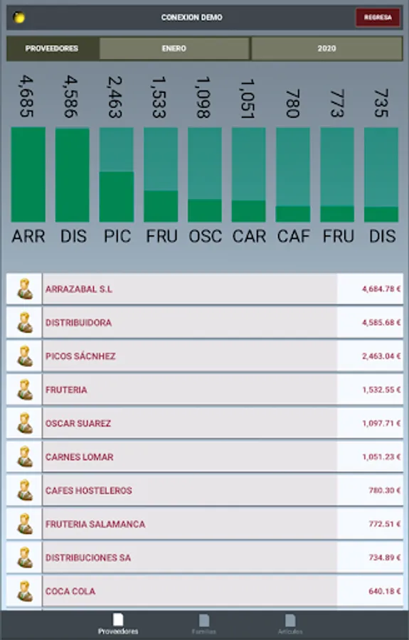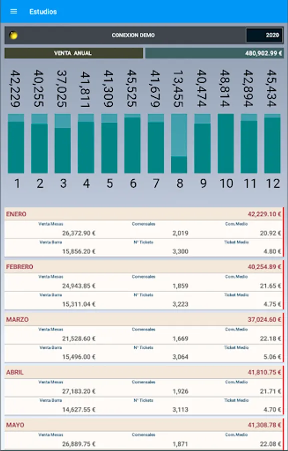 Desglose diario, mensual, anual. Ventas por camareros, comida y bebida, comensal medio, número de operaciones… Artículos, proveedores, familias y rentabilidad.