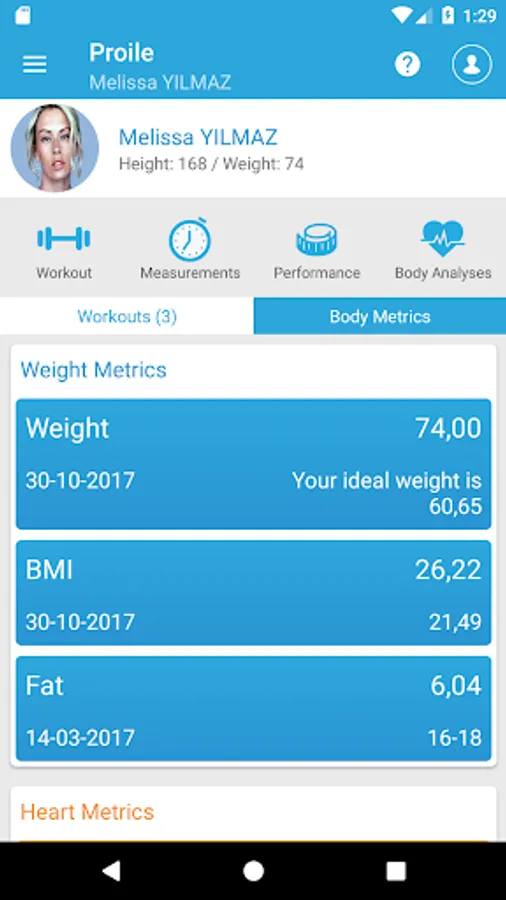 Metrics, Insights and Performance Metrics: Enter your metrics periodically and measure your performance. With the Measurements you receive, you can analyze the metrics like WEIGHT, VOLUME, HEART, HEALTHY AGE and DIABETES.