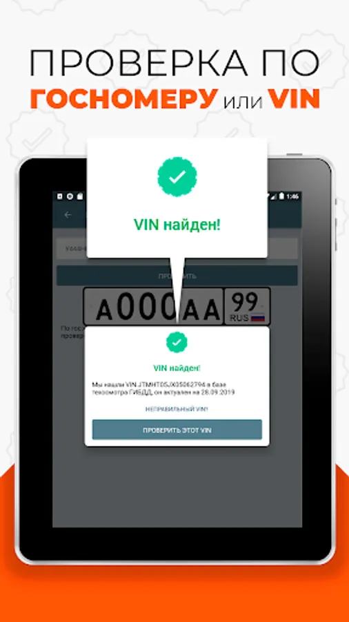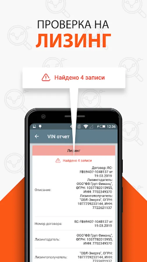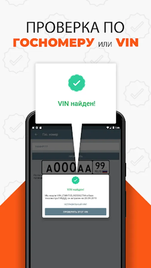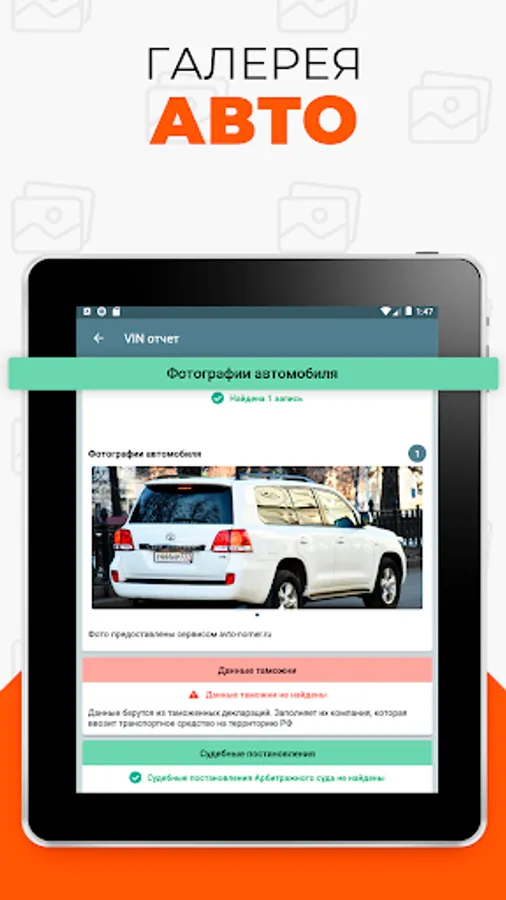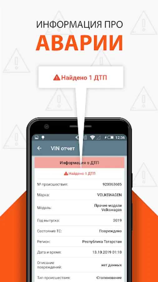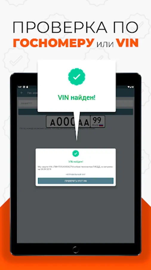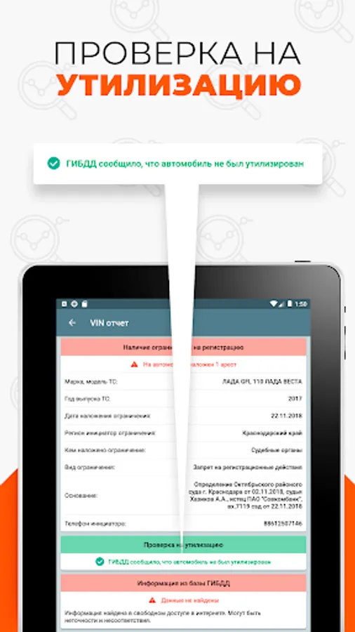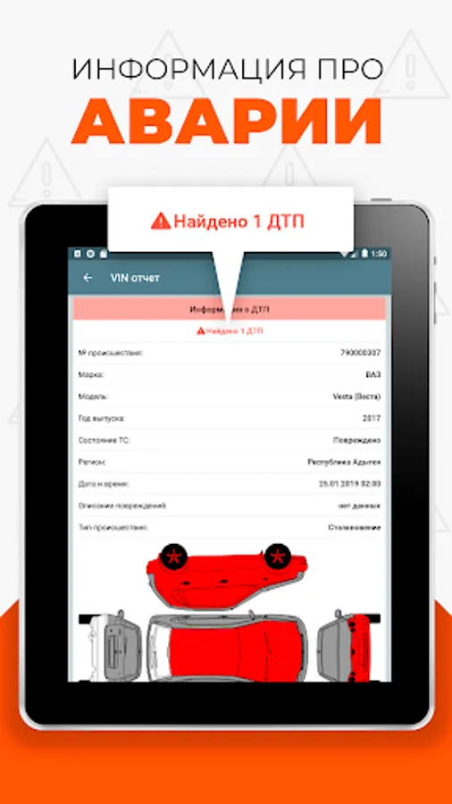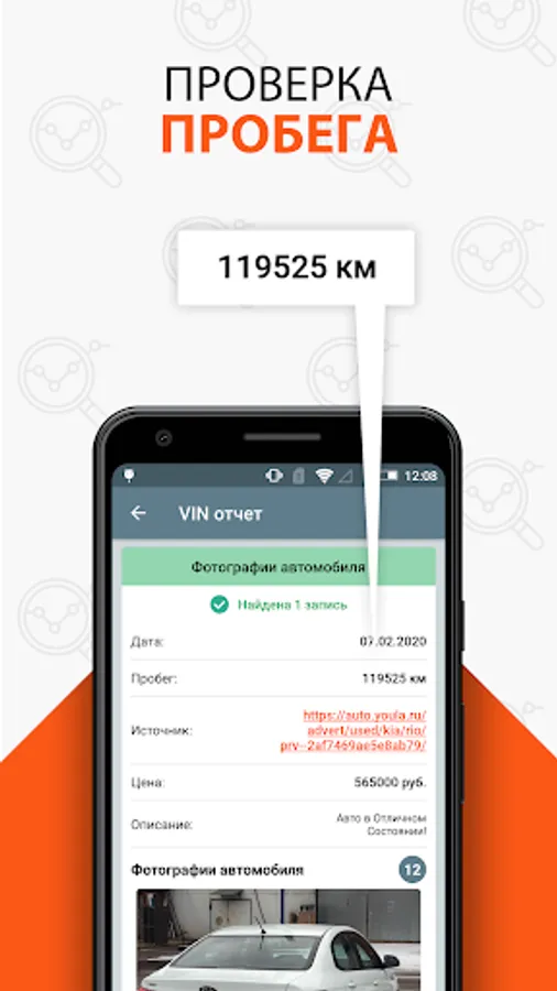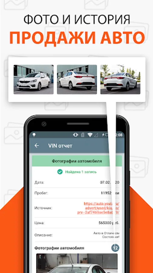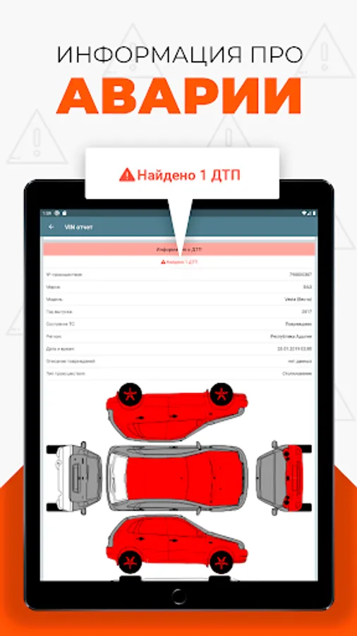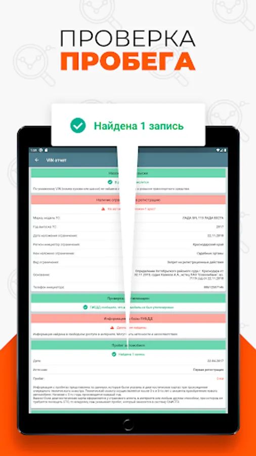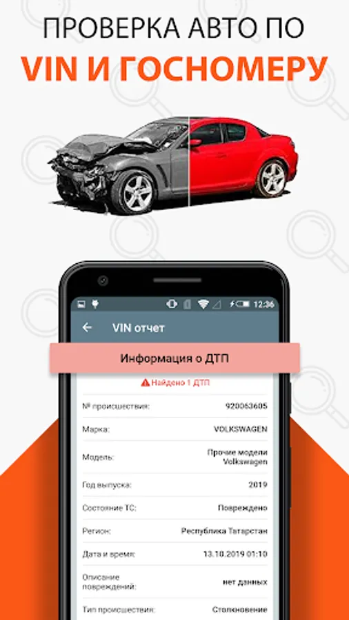 Download the full report. The application allows you to download a complete report on the vehicle and share the data in the messenger or social networks. The application keeps a history of your requests, but does not store data on them. An internet connection is required to obtain information.