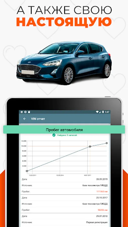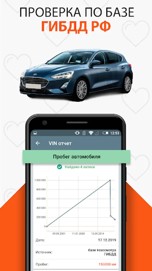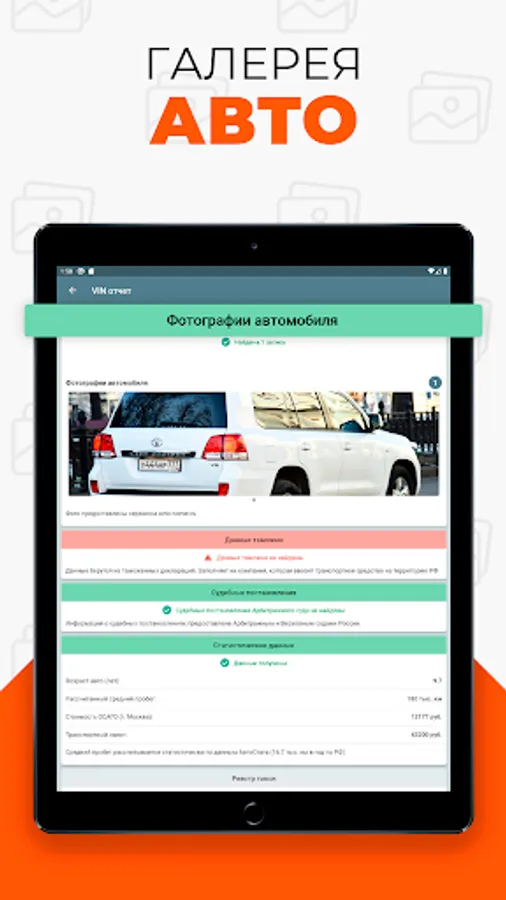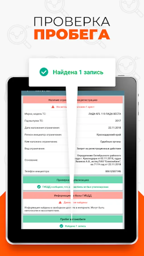 Check in the application how you used the car and under what conditions it was purchased, using the data of customs, the taxi register in Moscow and the regions, information from international auctions, leasing reports, the pledges register and the car sharing database. For example: