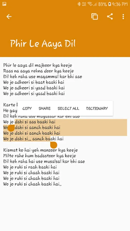 COPY LYRICS: While reading lyrics, either click on copy button to copy the entire lyrics or you can copy/share your favorite lines from songs lyrics..