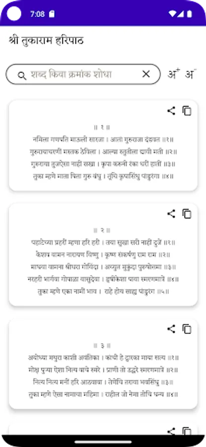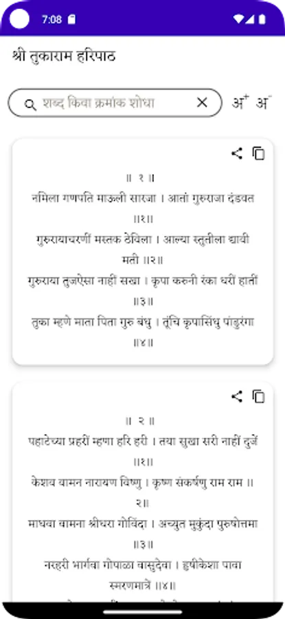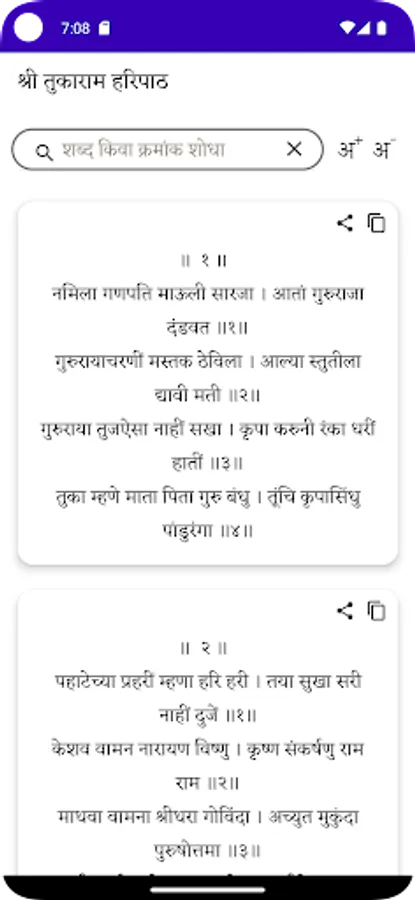 Haripath app contains haripath written by Sant Naamdev, Tukaram, Nivruttinath, Dnyaneshwar and Eknath.Haripath app also contains Aarti sangrah along with the swadhyay shlokas. Additional abhangas, dharmik sant sahityas will be updated in future updates.