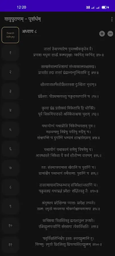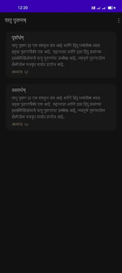 The Vayu Purana is a Sanskrit text and one of the eighteen major Puranas of Hinduism. Vayu Purana is mentioned in the manuscripts of the Mahabharata and other Hindu texts, which has led scholars to propose that the text is among the oldest in the Puranic genre. Vayu and Vayaviya Puranas do share a very large overlap in their structure and contents, possibly because they once were the same, but with continuous revisions over the centuries, the original text became two different texts, and the Vayaviya text came also to be known as the Brahmanda Purana.