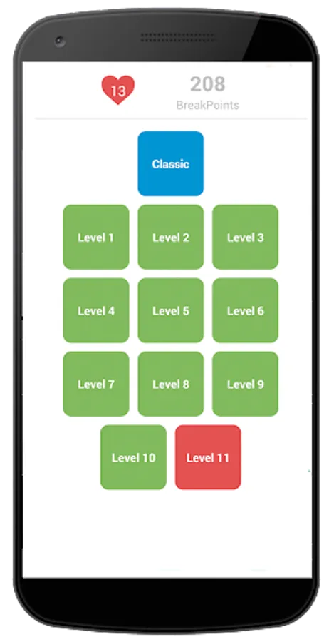 ◉ Classic: eliminate as many squares as you can until you fail. Each eliminated square gives you 1 BreakPoint, which you can use for buying lives (see Levels game mode). Watch other players' scores in the ranking, and share your scores. Can you beat your friends? What about reaching #1 in the global ranking?