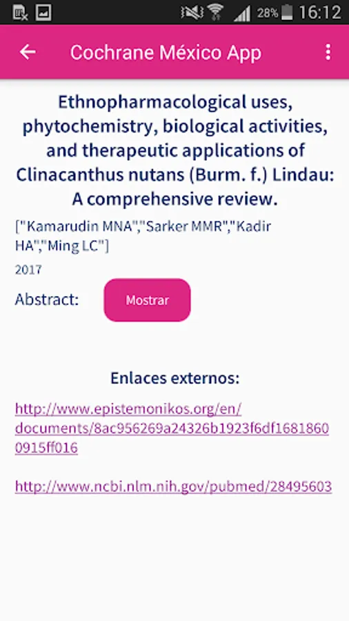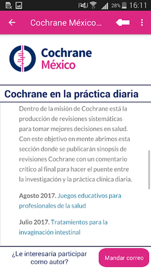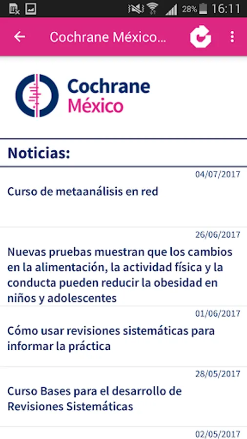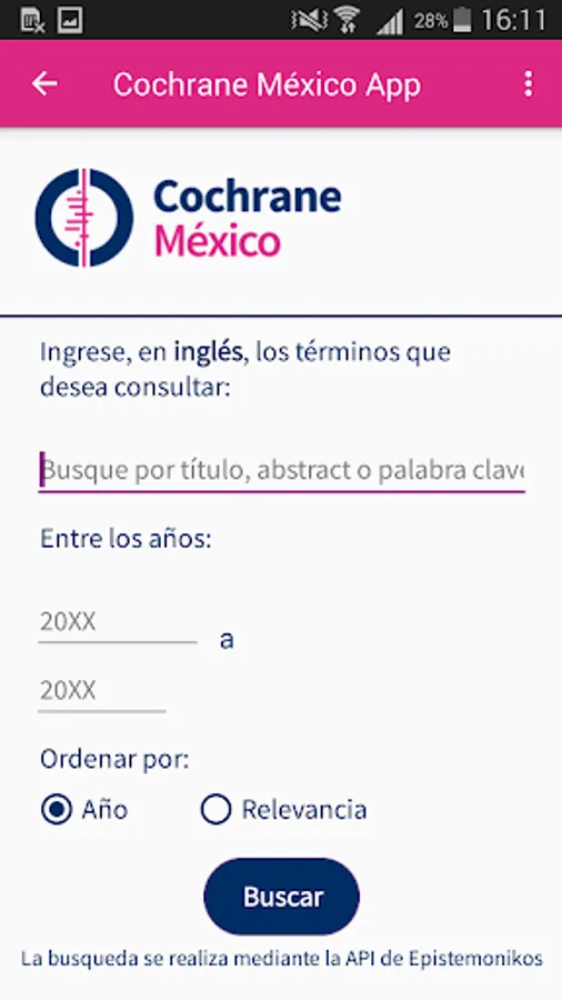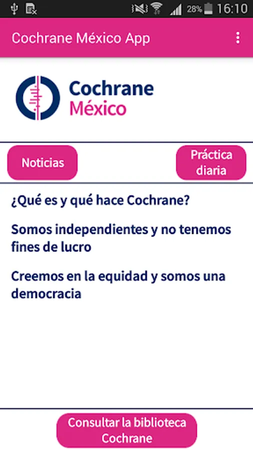 Mobile application that displays information about Cochrane Mexico: General organizational data, news, Cochrane section in daily medical practice and includes the option of consulting items from the Cochrane database via API Epistemonikos.