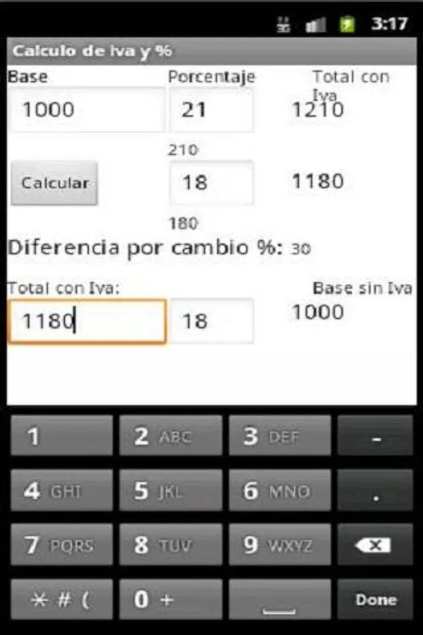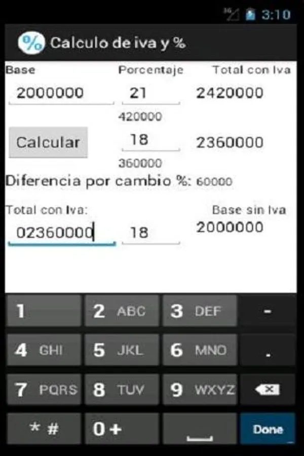 With this application you can easily calculate the price with VAT that corresponds to a base simultaneously with the 18 or the 21 or the 8 and 10 and their difference, ie the increase caused by the increase in VAT. Similarly and simultaneously you can calculate the base corresponds to a final price and VAT leads, ie a pvp.