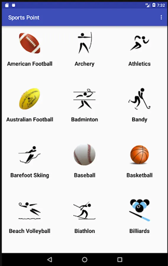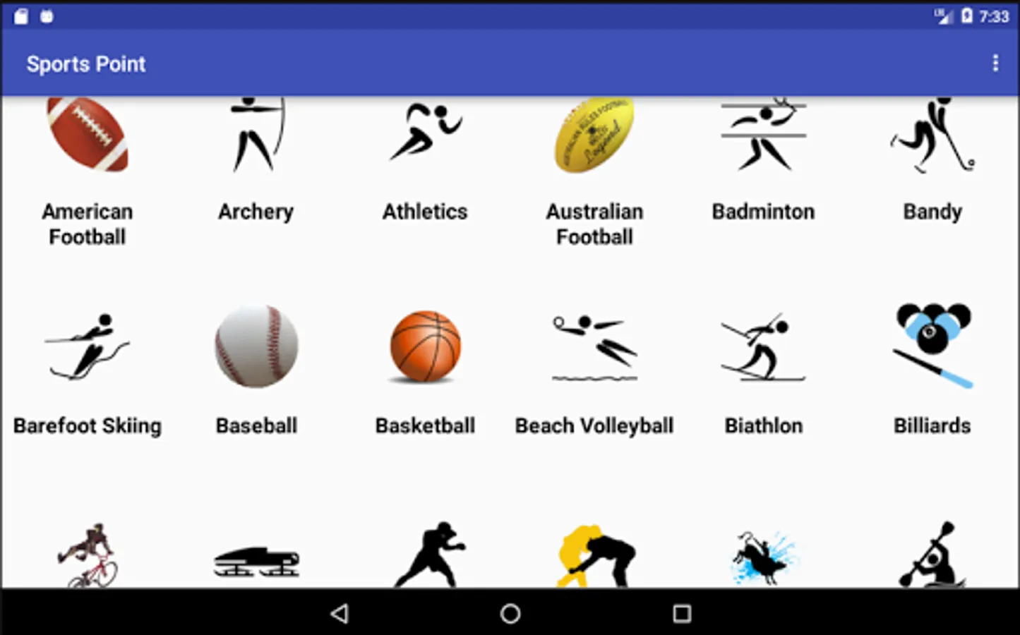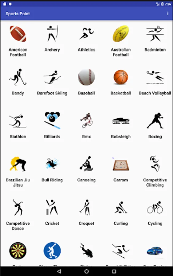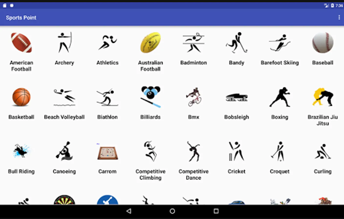 There are 100 sports in total sorted alphabetically presented together on the application dashboard. Navigate to and tap on the sport you are interested in and you will be presented with all the details you need for that sport.