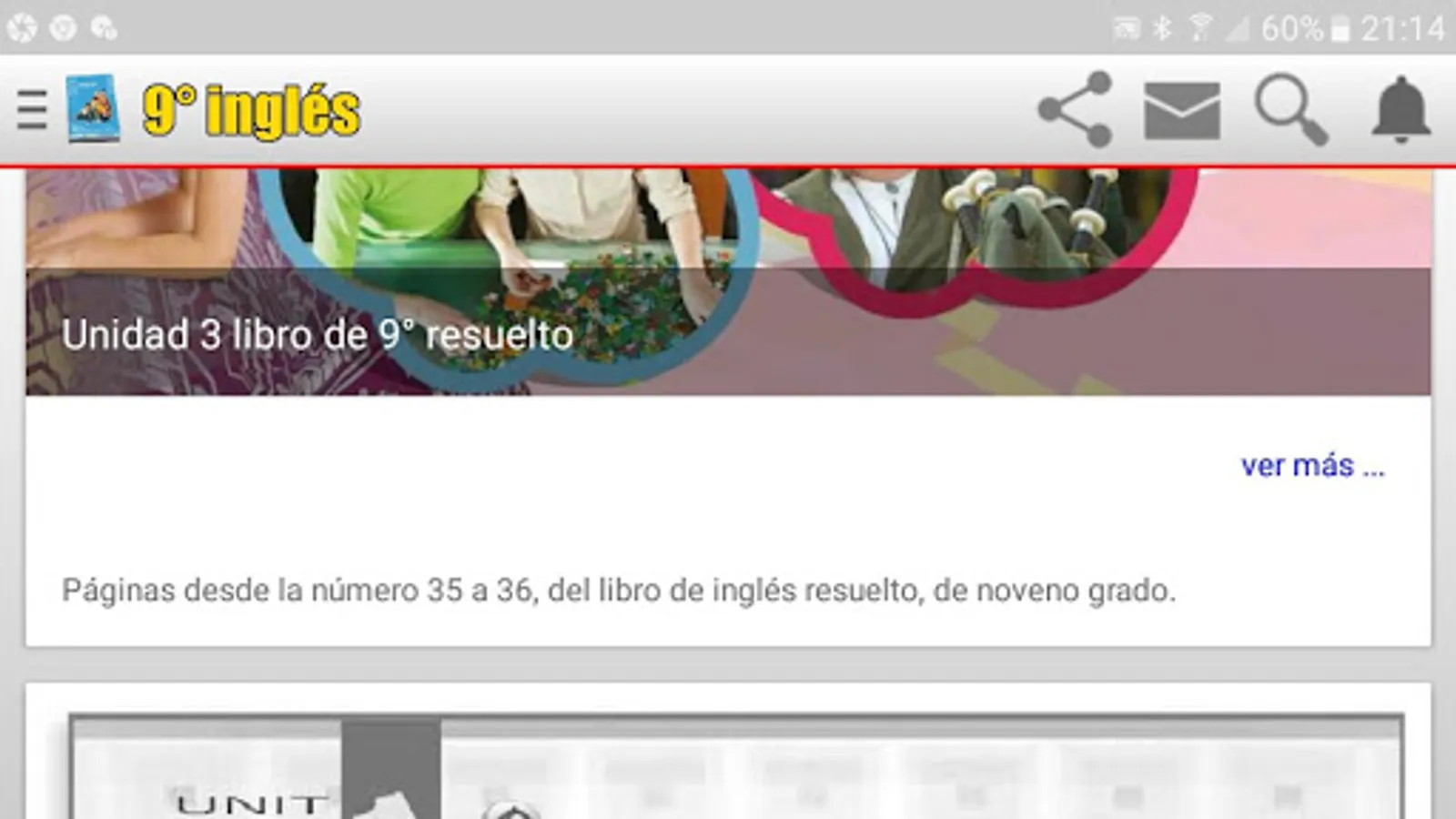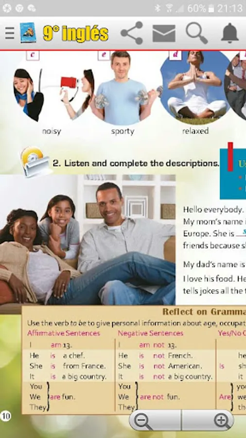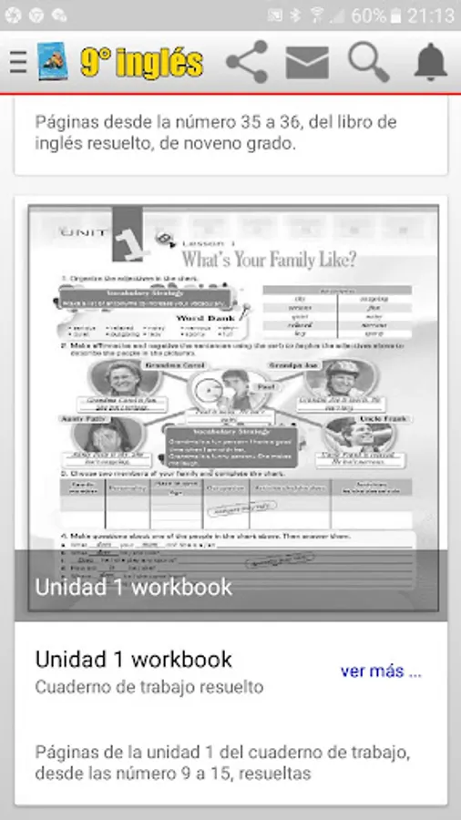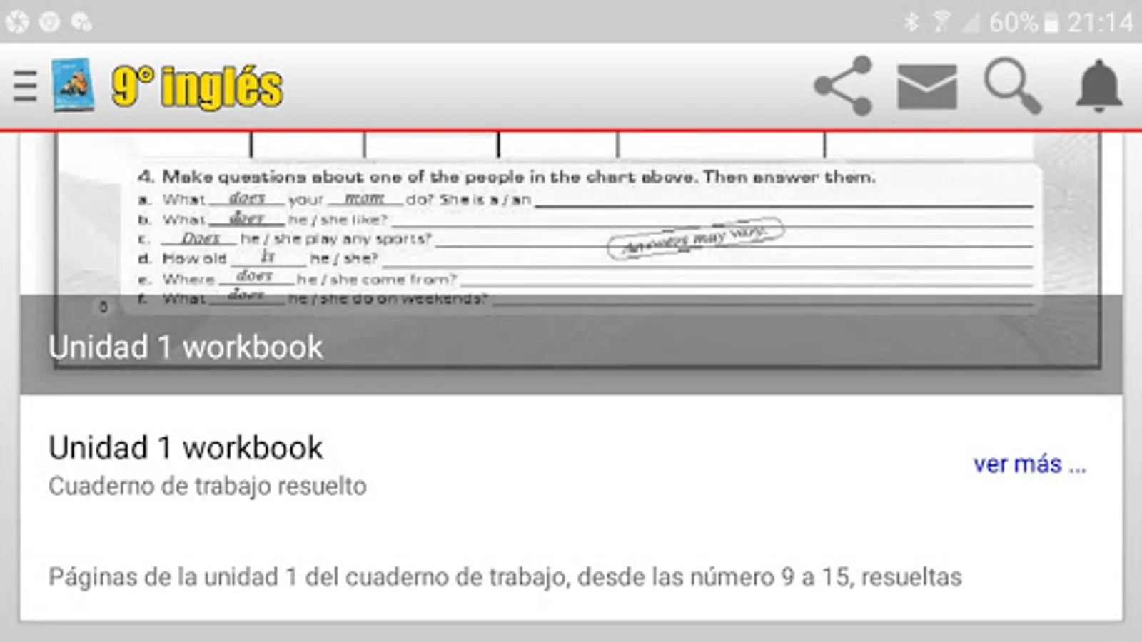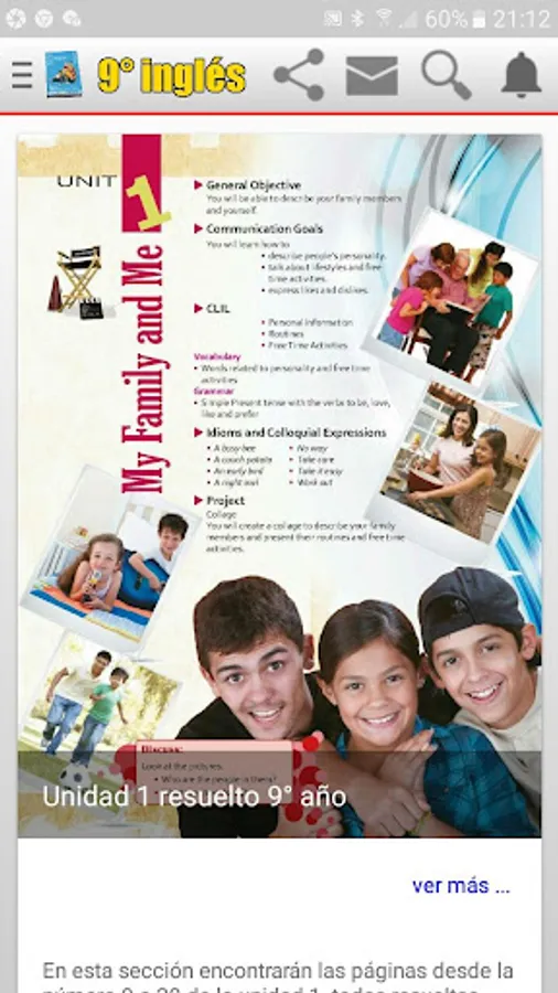 Ninth year English book, solved, both in the color sheets and in the black sheets, that is, the workbook and the sheets that the teacher works with, some sheets of the workbook have several answers and that is why it is not placed one solution, but in most sheets they will find the tasks solved.