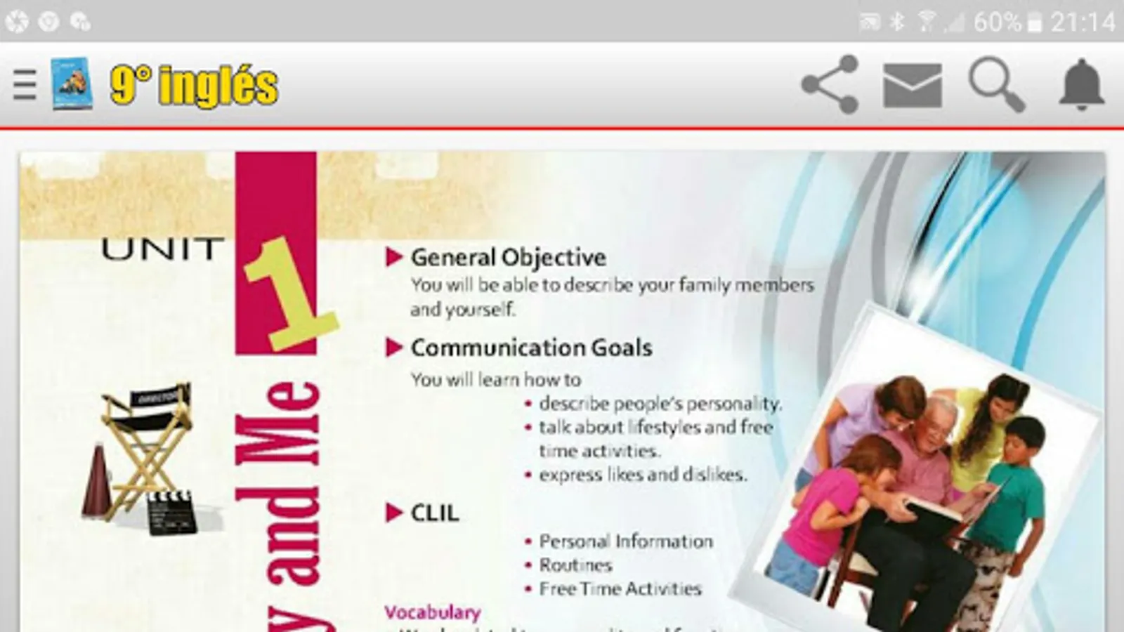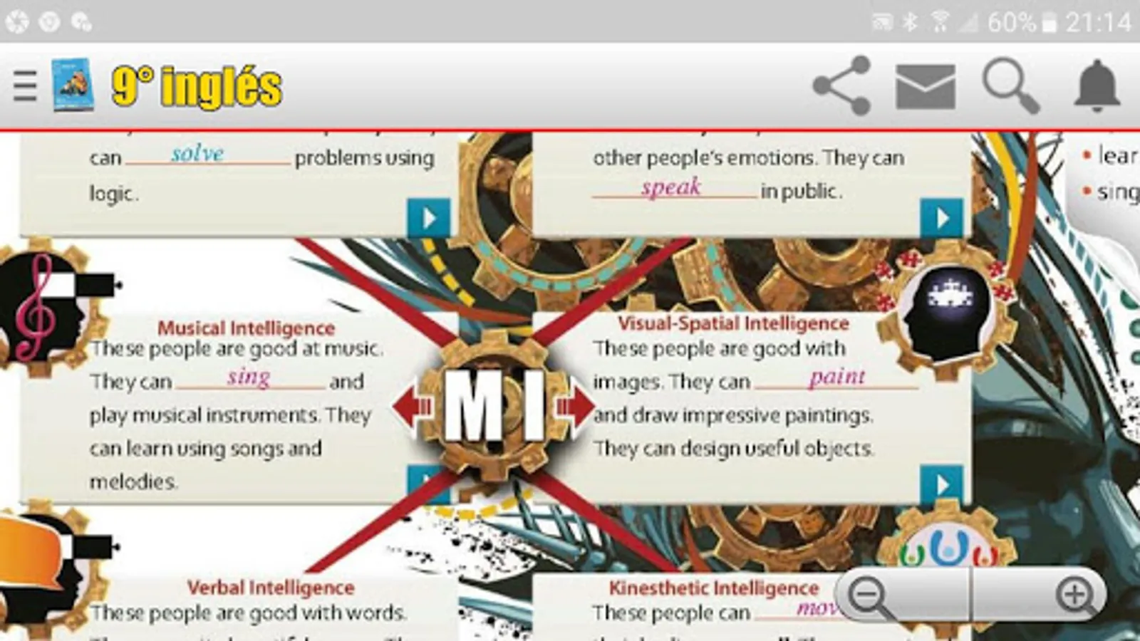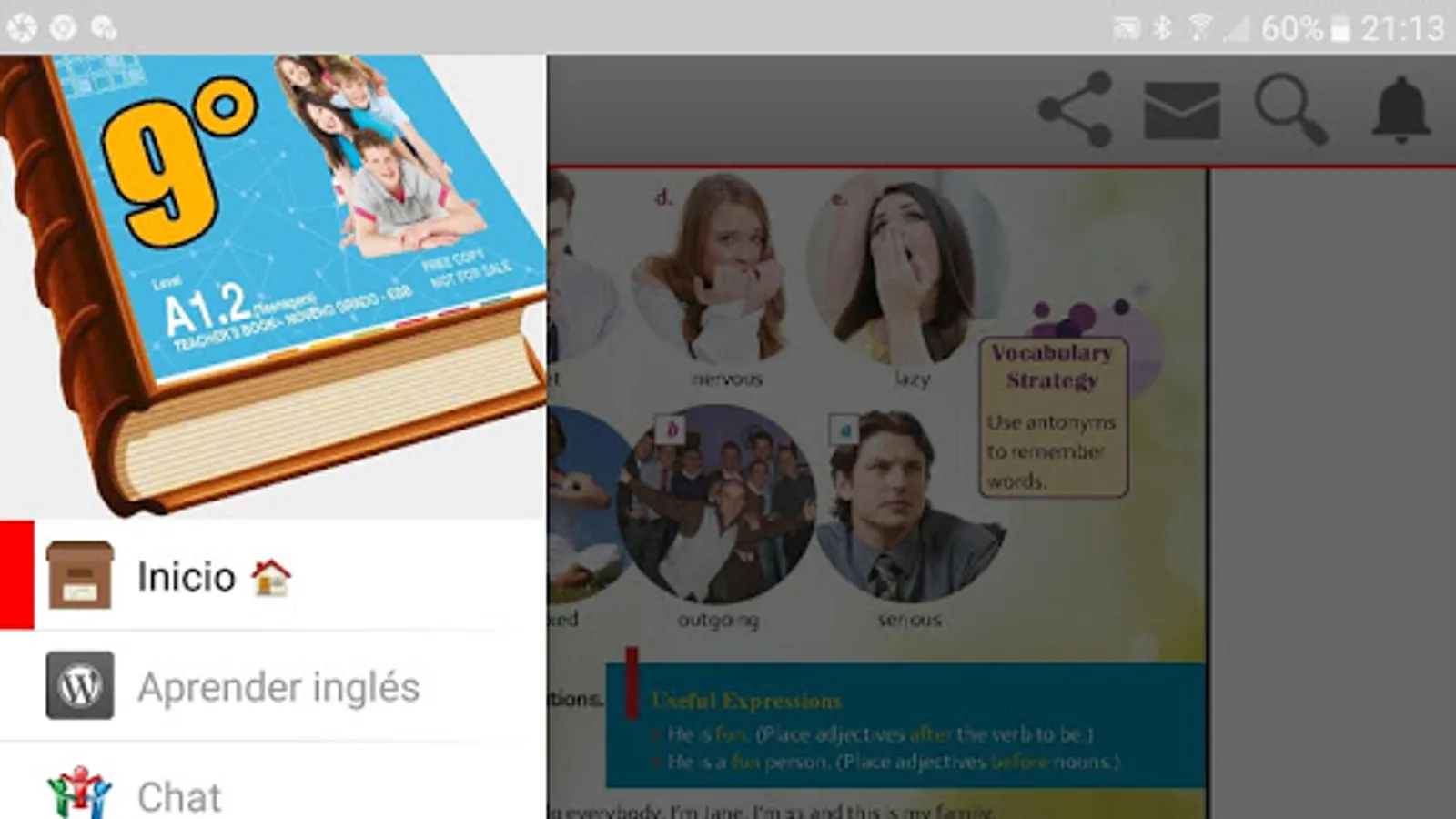 Ninth year English book, solved, both in the color sheets and in the black sheets, that is, the workbook and the sheets that the teacher works with, some sheets of the workbook have several answers and that is why it is not placed one solution, but in most sheets they will find the tasks solved.