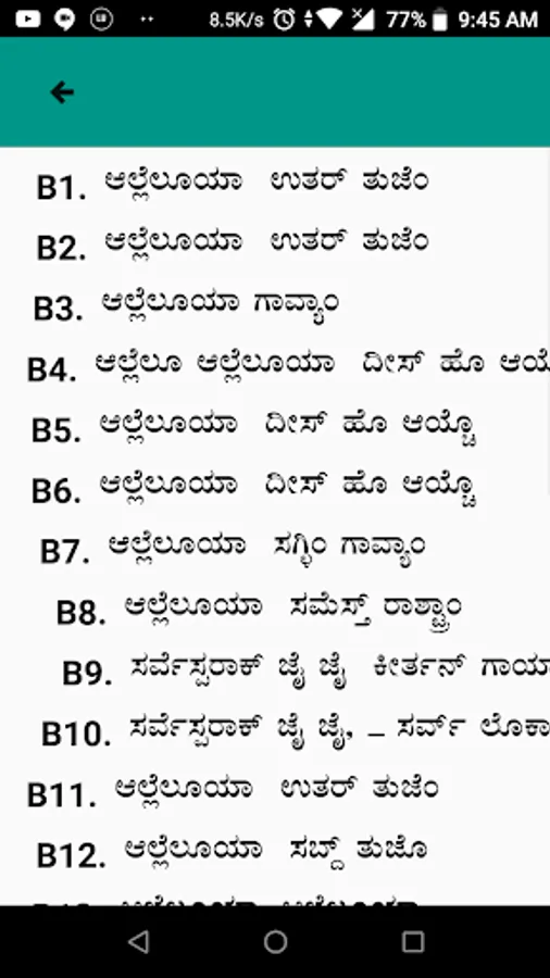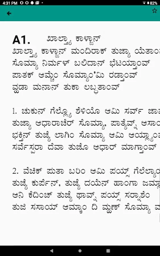 Konkani language is one of the greatest languages in west coast of India. Its our pride and responsibility to make our language more wealthy. This app is one step in that direction. We the konkani people of Mangalore must be happy to have this app in konkani language which is our mother tongue. This app has used konkani script unlike the other konkani platforms. This app has the lyrics of konkani devotional songs and hymns originally taken from ‘Somyak dinvasuya gaionocho jhelo’ book published by Mangala jyothi.