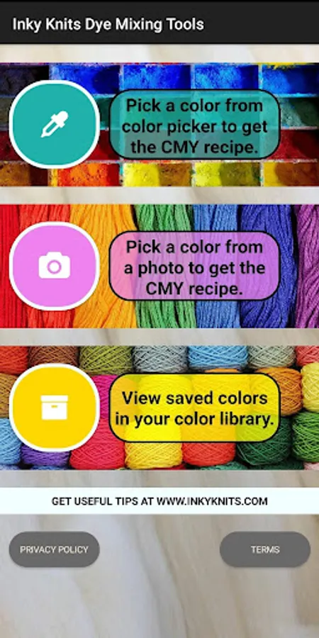 The Inky Knits Dye Mixing Tool is used for getting the dye mixing recipe for mixing Cyan, Magenta and Yellow colored dyes to any color that is picked using the app. You can use the color picker or you can take a photo and pick a color to get the CMY mixing recipe. Additionally, you can save your favorite colors and recipes in the app for later use.