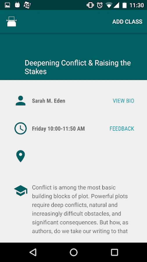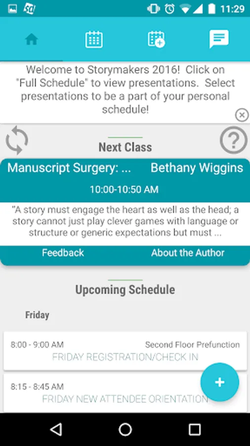 The Storymakers Conference app allows you to organize your schedule for the Storymakers conference. It also brings additional descriptions on each of the many presentations available as well as pictures and bios of the speakers involved. As you go from class to class during the day, it will keep track of which class you will need to go to next, as well as let you give digital feedback to the Storymakers Conference organizers.