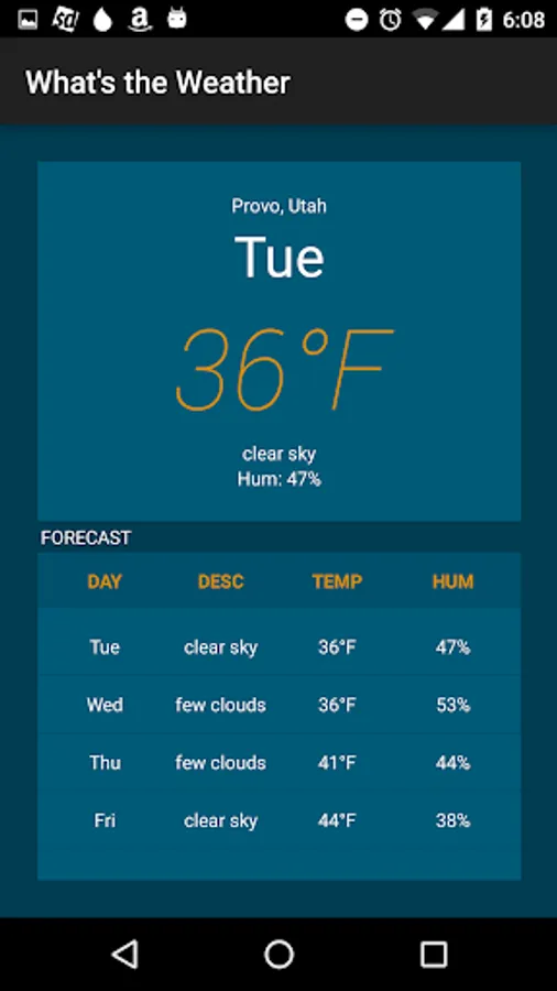An easy to use app to check the weather today, as well as a week in the future. Great for spur of the moment needs to check what the weather has in store for your location.