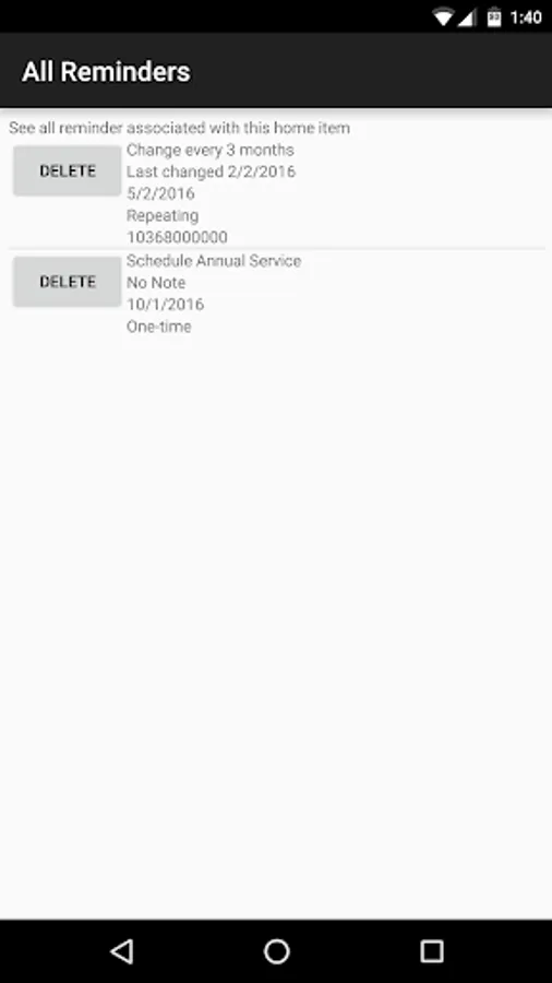 * Set custom reminders to alert you to regular tasks for each item in your home