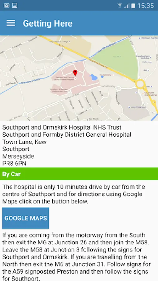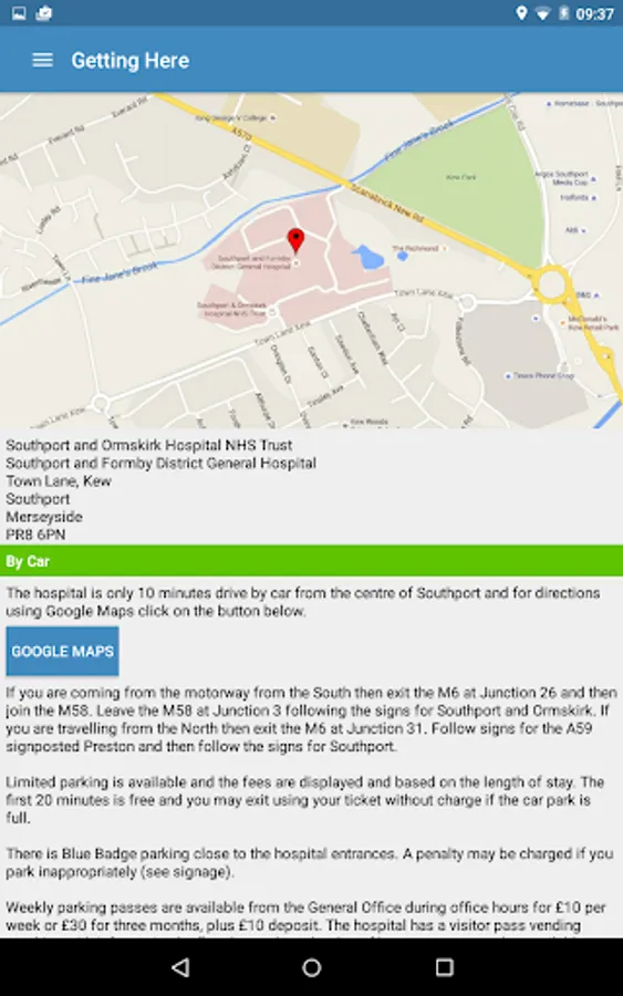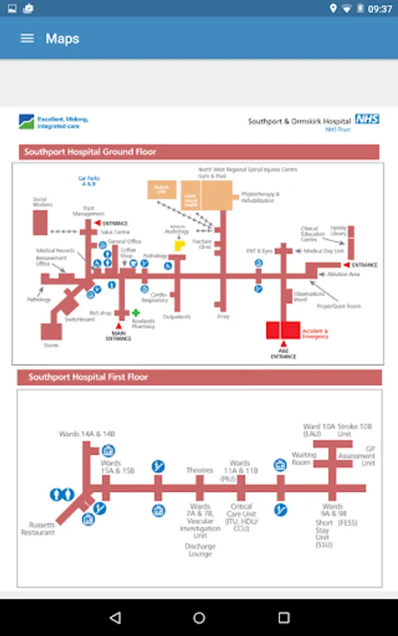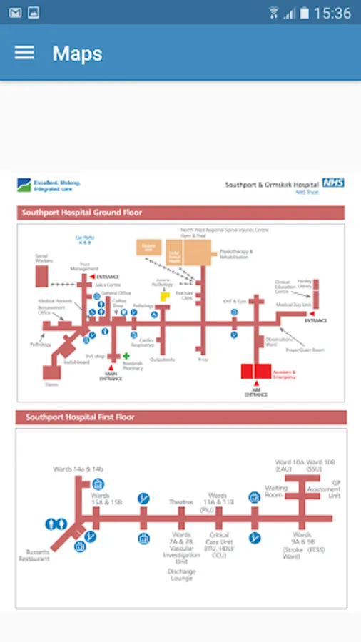 The app also contains information on key hospital phone numbers, car parking information and clear and concise instructions on how to get to Southport hospital by car, public transport, or on foot.