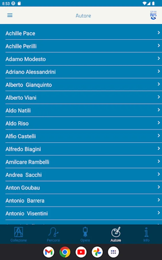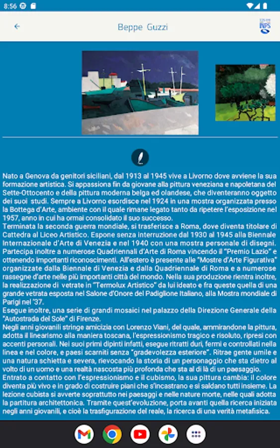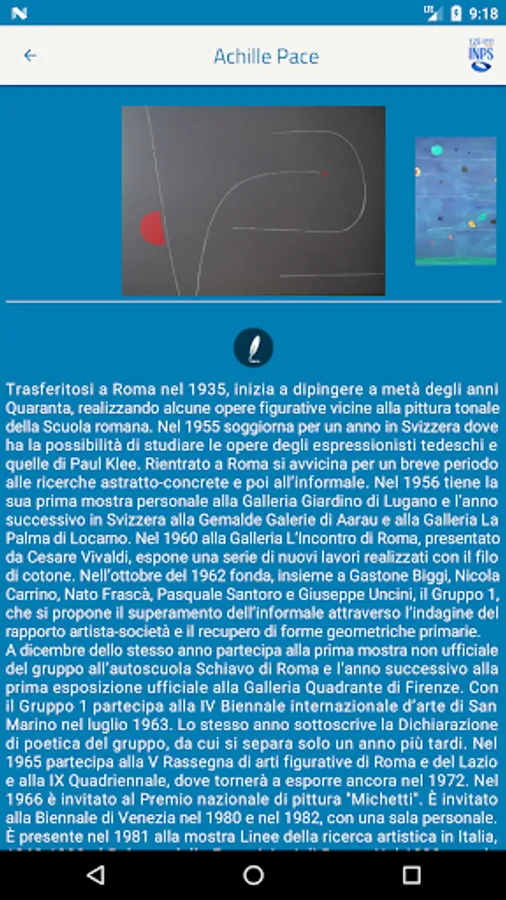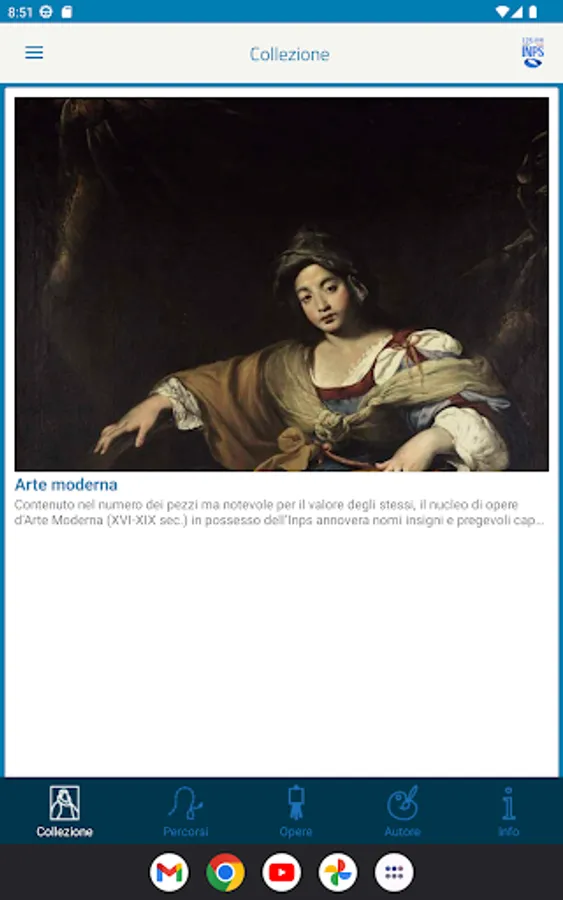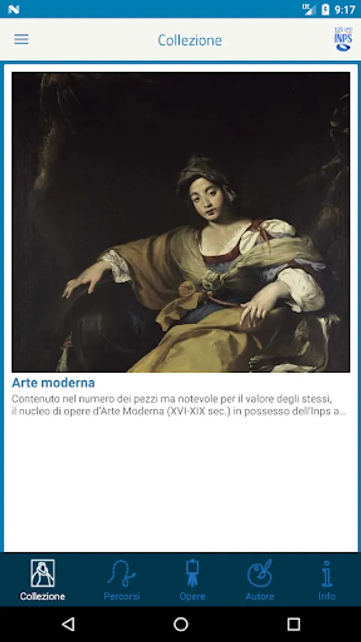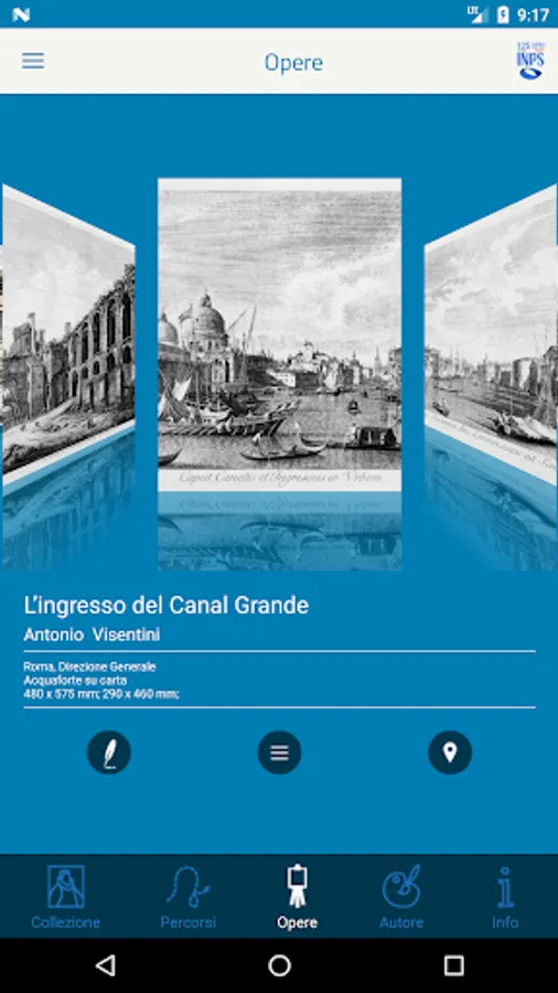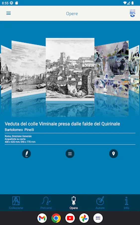 The INPS application "INPS - Museo Multimediale" allows you to view the artistic heritage of the INPS and collects movable and immovable works of great importance, acquired or created over the course of an entire century and now located among the various representative rooms and individual Institute offices.
