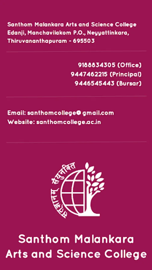 Santhom Malankara Arts and Science College (Santhom College) is entrusted with the ‘Marian foundation for unity and integral progress trust’ and His Beatitude Baselios Cardinal Cleemis Catholicos serves as its president. It is established, managed and administered by the Catholic Diocese of Parassala of the Malankara Catholic Church and under the partonage and management of Most Rev. Dr. Thomas Mar Eusebius, the Metropolitan of the Catholic Diocese of Parassala.