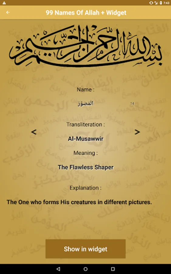 Learn through this application one of the 99 beautiful names of Allah each day.
