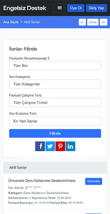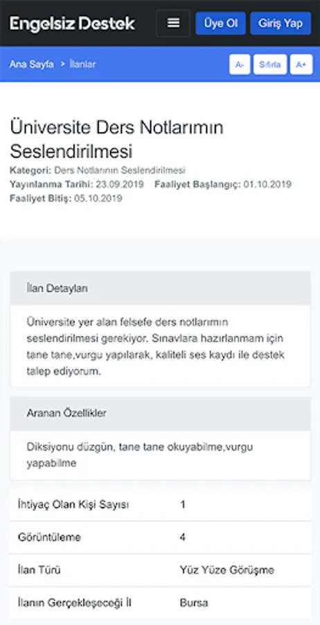 Access to Notes, One-to-One Work, Testing & vocalization, Library VB. Requests for Guidance in Research Environments, Reading of Examination Papers, Facilitations in an Organization and Support for Different Issues in Accessibility in Education may be requested. However, no announcements shall be made on this platform for the request for financial support or activities that may be carried out for a certain fee.