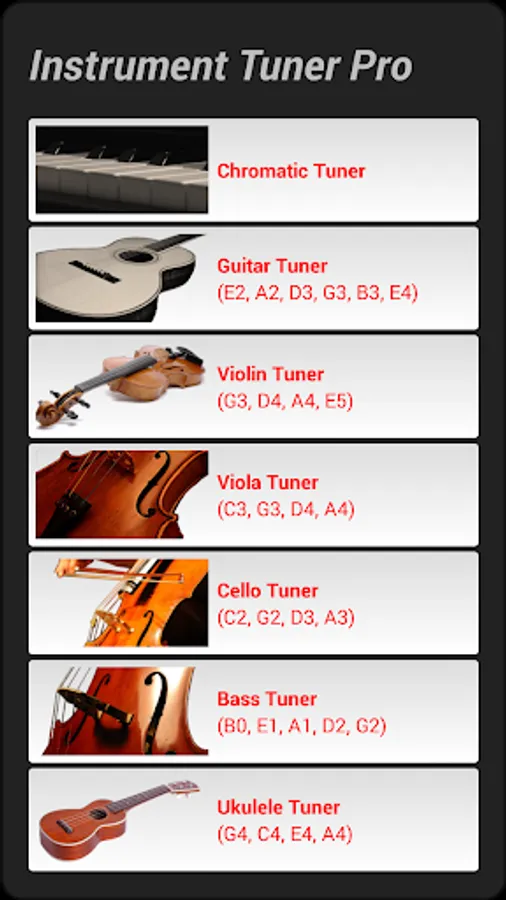 Instrument Tuner Pro turns your android mobile phone into a portable chromatic tuner. It will let you tune any musical instrument with a very high accurateness (up to ±1/100 semitone (±1 cent) precise) and a wide range that covers A0 (27.50 Hz) – C8 (4186.01 Hz).