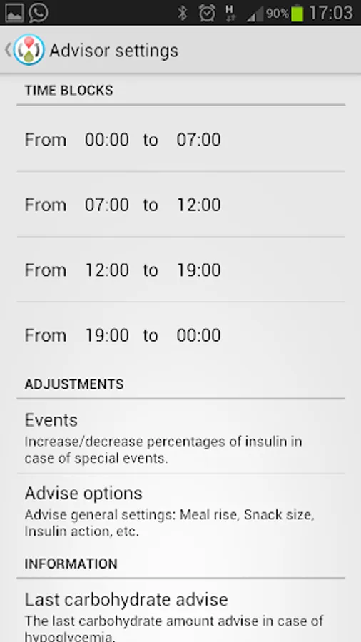 - Complete set of configuration variables for diabetes (insulin sensitivity, carbohydrates ratio, target blood glucose, insulin active time, etc.) for different time ranges.