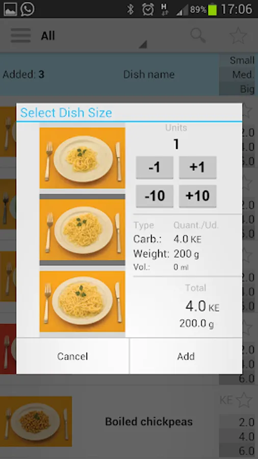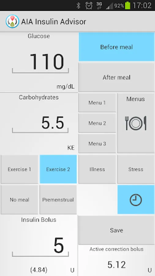 Carbohydrates can be entered directly or using the menus function. This function provides the amount of carbohydrates directly from an intuitive predefined food database with pictures, dishes with different sizes, weights, volumes, etc. It is also possible to introduce additional conditions for the calculation, such as whether physical exercise has been performed, a disease is being present, stress, etc.
