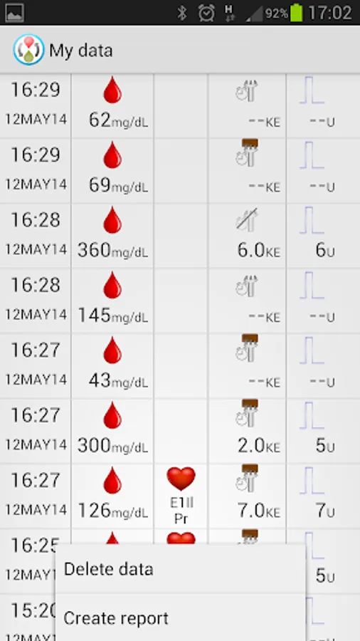 All measurements are stored in a database, including the blood glucose value, the carbohydrates amount, the insulin value, events, etc. Besides being able to review it at any time, a report in web page format can be generated which, transferred to a PC, can be printed for reviewing with the doctor, etc.
