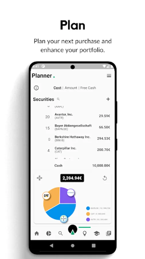 insyt allows you to capture the components of your portfolio in a compact manner and shows you the most significant indicators to track its performance. With our planner you can plan your next purchases efficiently. Use our finder, if you are open to new ideas and want to find out which stocks and ETFs might perfectly fit into your portfolio.