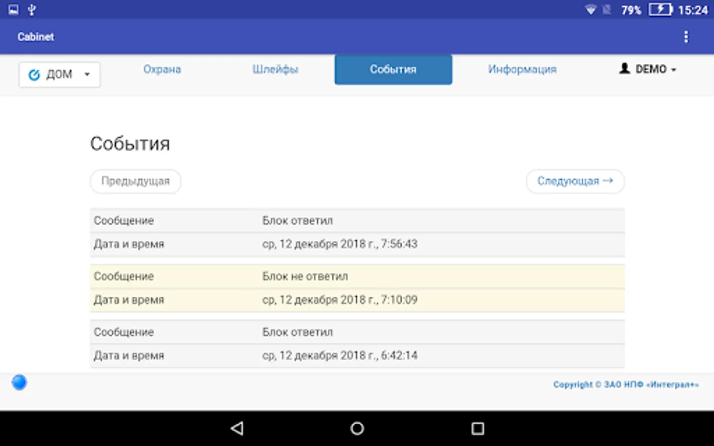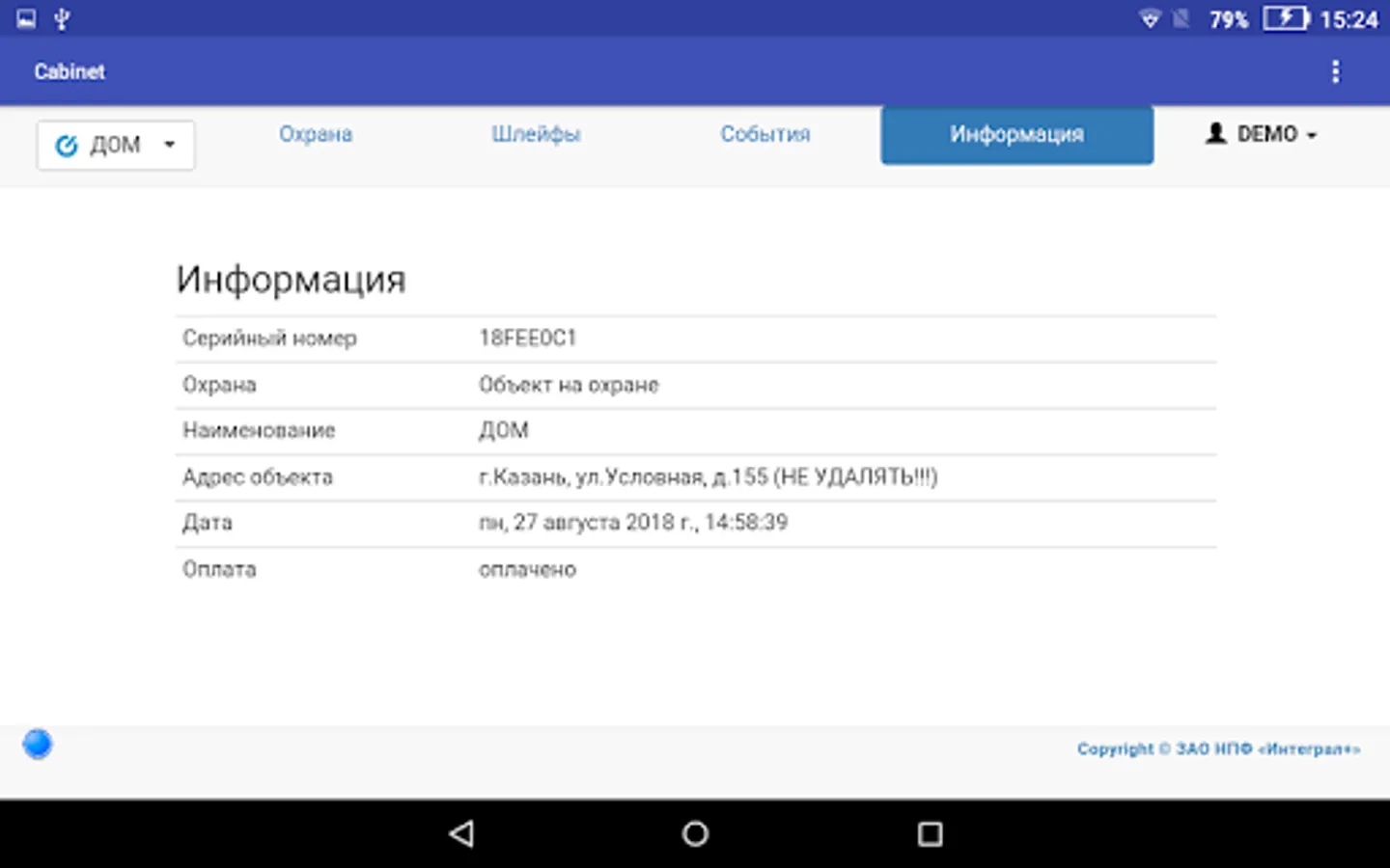 - receive notifications about occurring events at the facility (Armed, Disarmed, Alarm, etc.)