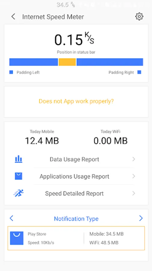 Internet speed meter free application to add speed meter on status bar and always track internet speed. Internet live speed in status bar. You can change Internet speedometer position on status bar. Internet speed meter application shows daily data usage of last 30 days: Mobile data usage, wifi data usage and application data usage since bootup. Internet Speed Meter and Data Usage free application allows you to monitor data usage for last 30 days, data usage per day and track internet speed in status bar. Also You can see internet speed detailed report and data usage per app. Internet speed meter application allows you to see realtime internet speed in status bar. Change internet speed meter position on status bar. Internet speed meter on status bar anywhere you want. It is helpful to track internet speed in notification bar, track application speed, internet data usage.