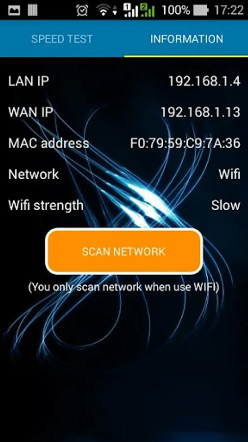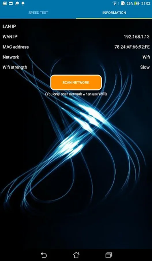 - View information about your network (LAN IP, WAN IP, MAC address, WiFi strength, Mobile Data strength, Information of your Internet Service Provider)