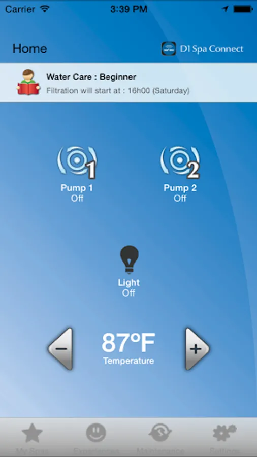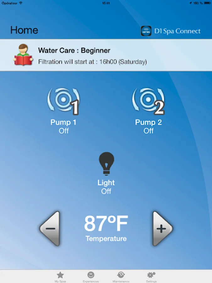 Using a wireless or cellular Internet connection, the D1 Spa Connect app provides a user-friendly interface that allows you to control your hot tub functions from outside of your spa, such as: