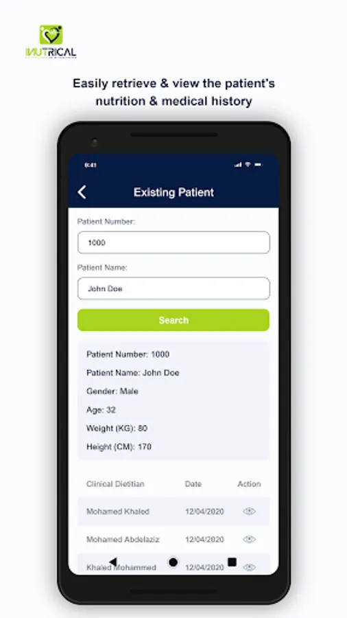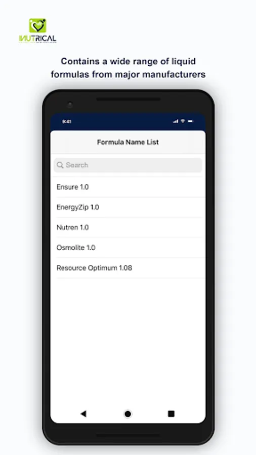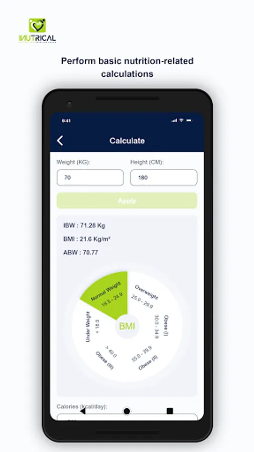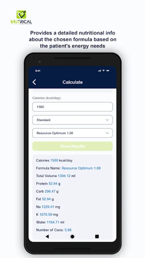 iNutriCal App enables users to precisely calculate the nutrient contents in the enteral liquid formula provided to patients based on their energy requirements. In few clicks, clinical dietitians can perform necessary calculations such as ideal body weight (IBW), body mass index (BMI), adjusted body weight (ABW), and choose the suitable liquid formula for the patient based on their health status. Further, this App allows users to retrieve, view, and print patients' medical and nutritional history from iNutriCal database and easily share it with other healthcare professionals within the hospital.
