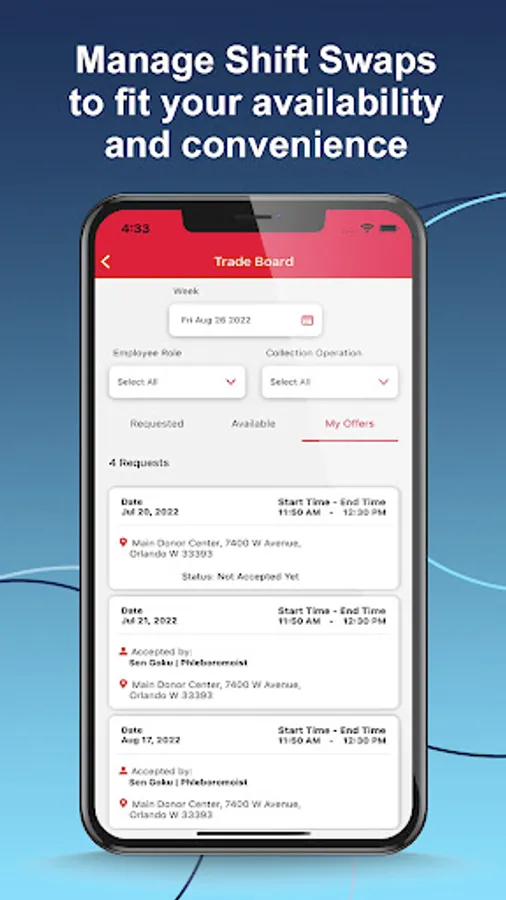 With InVita’s HemaCollect Staff App, you have the power to control staffing, schedules, and blood collections at centers and mobile drives. Whether you are frontline staff or a manager, you’ll have the resources at your fingertips to engage with others, weigh-in your schedule, and access the latest information you need to be successful. The HemaCollect Staff App nurtures staff retention, employee experiences, and work-life balance by empowering staff with the ability to trade shifts, communicate autonomously, and more!