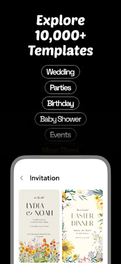 Personalize every detail of invitation design. User adjust font styles, color themes, and card making elements using drag-and-drop features. The app also includes advanced options like invitation editing app and card designer to ensure the invite reflects your personal style.