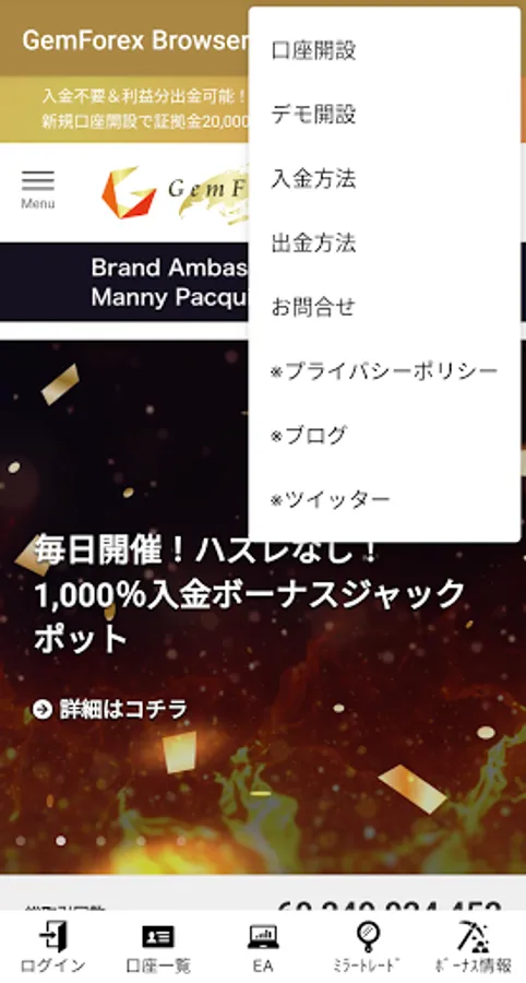 ・ Inquiry: Displays a link to the inquiry form screen for GemForex.
