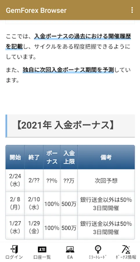 -Bonus information: Displays a link to a blog that summarizes the GemForex deposit bonus cycle.