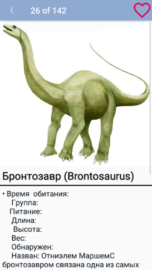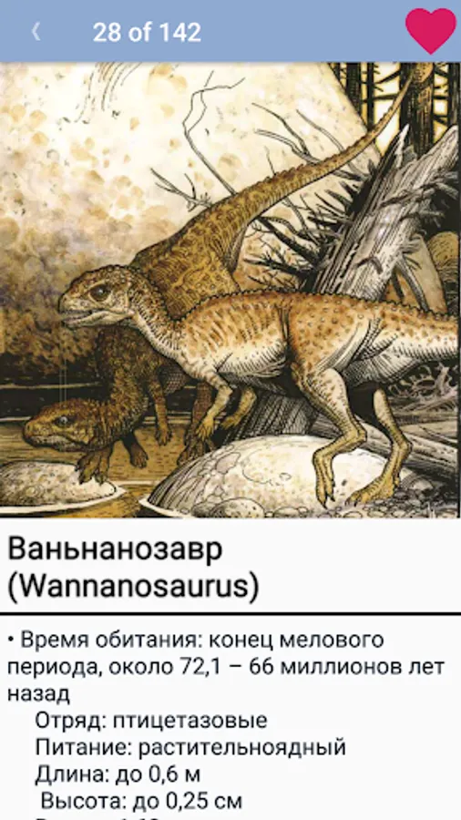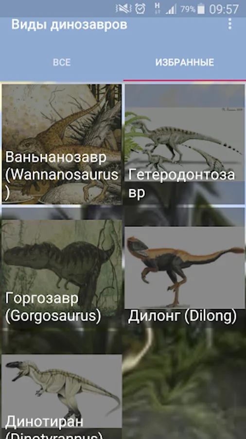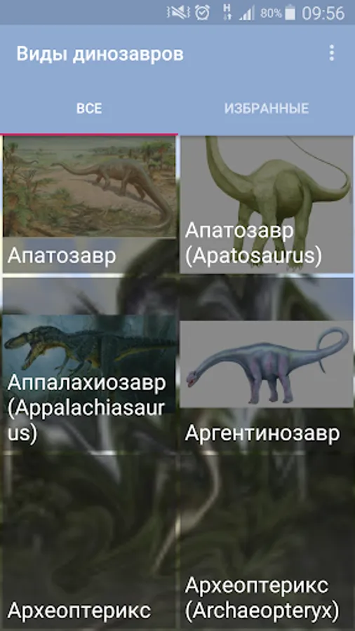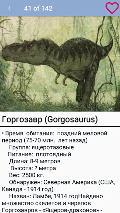 No species of animals that have ever lived or lived on our planet evokes such interest as dinosaurs. In the application "Types of dinosaurs" you will find many types of dinosaurs. The dinosaur encyclopedia app has two sections, one section contains all dinosaurs, and the other only your favorite dinosaur species.