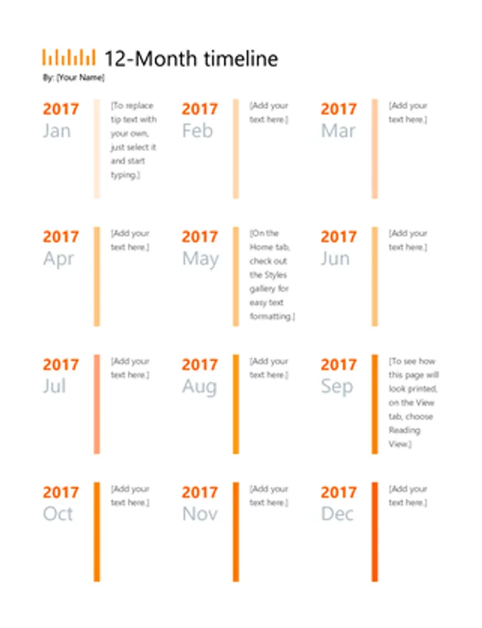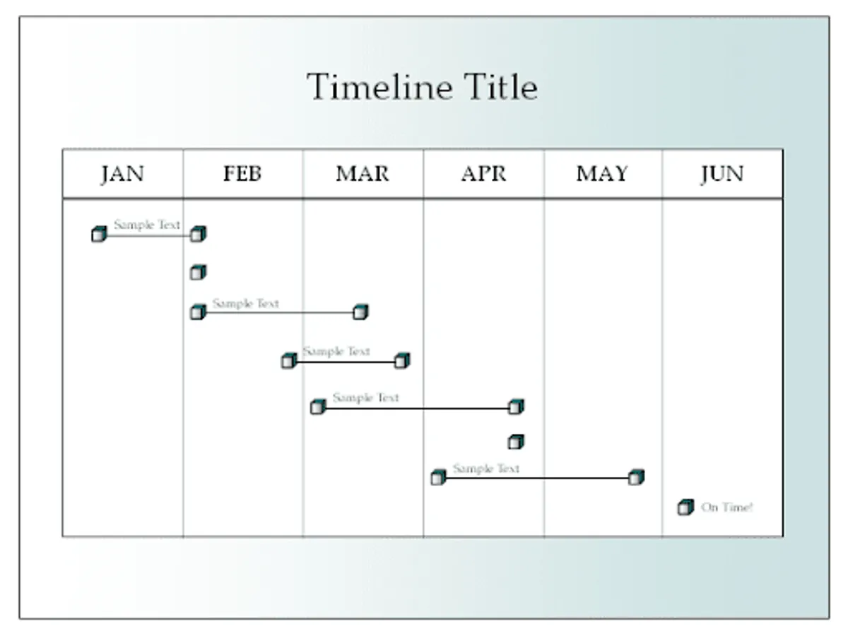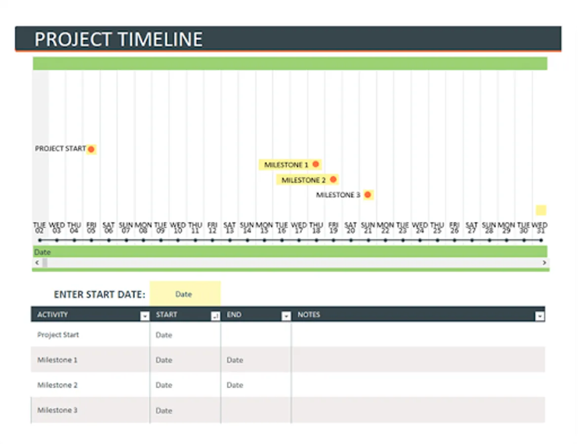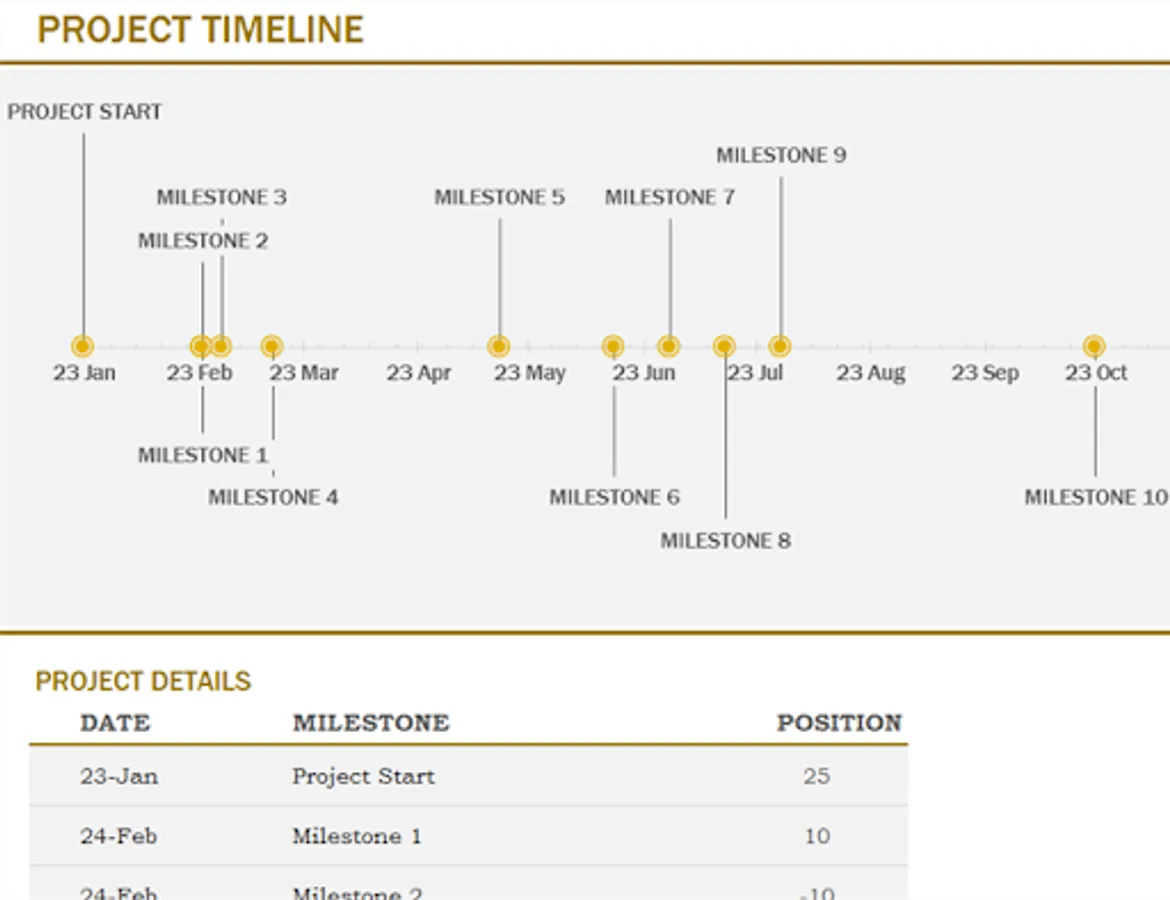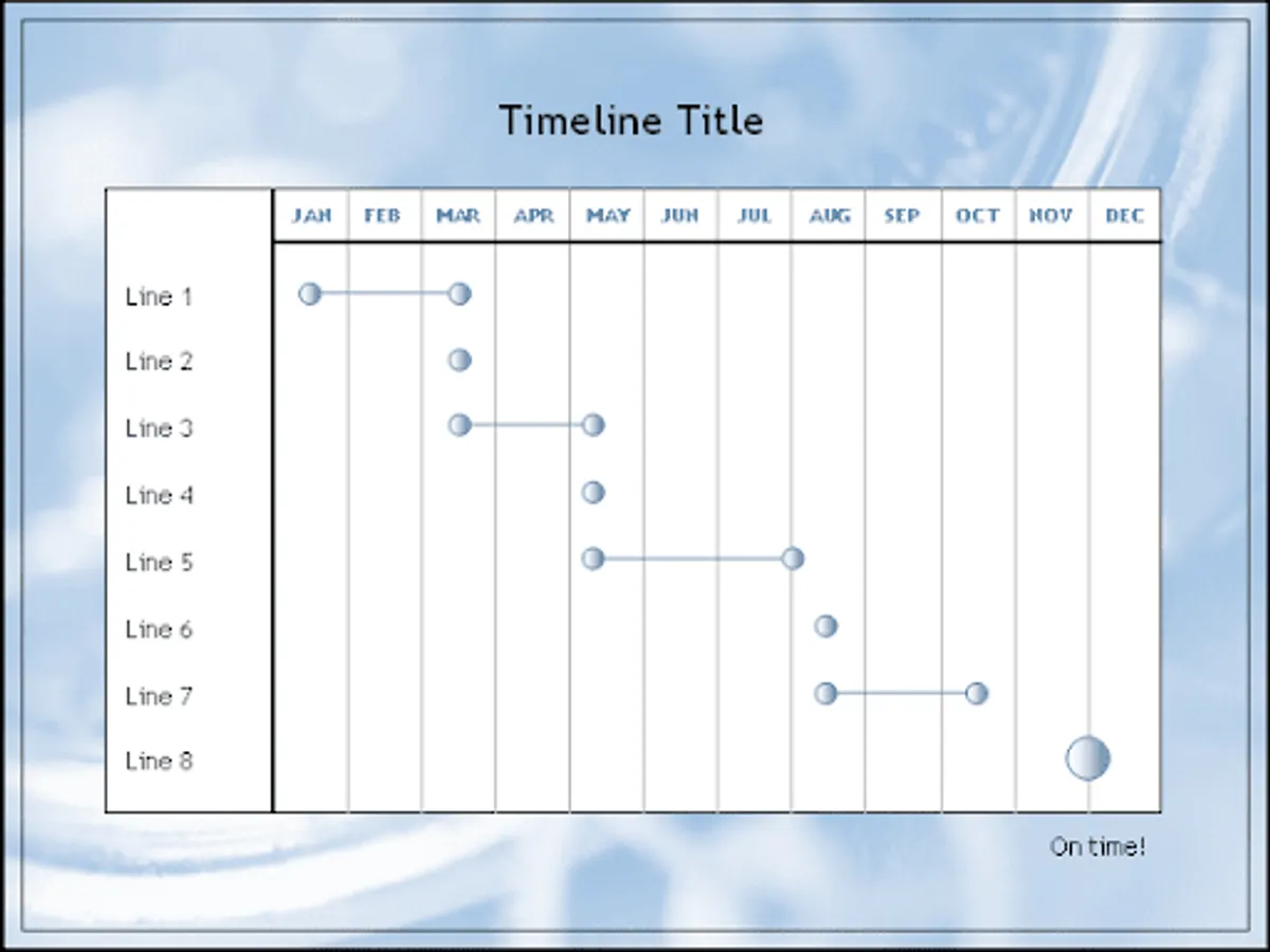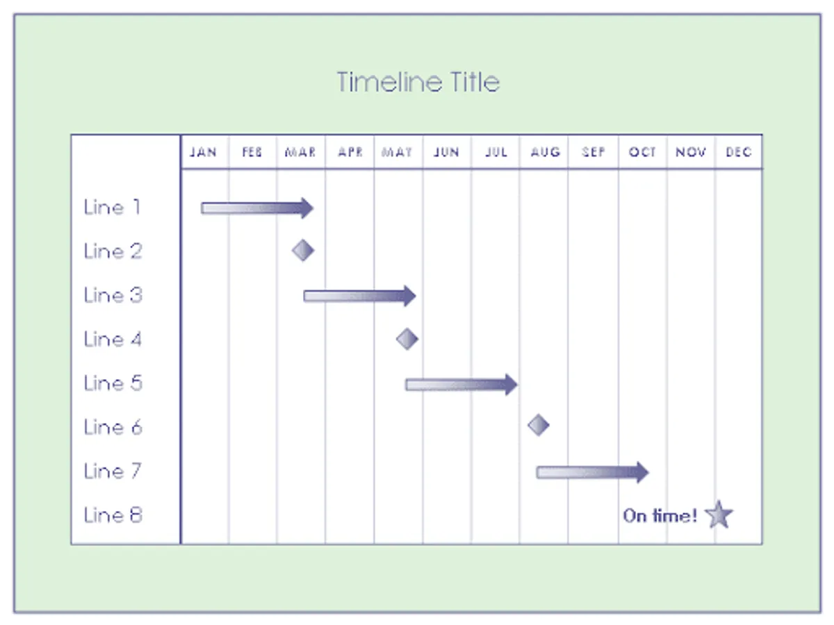 A timeline template is an essential tool for Project Managers and executives involved in planning. It allows the audience to understand where the planned activities are supposed to be and how much work remains undone. The purpose of a timeline is to display, in a summarized snapshot, this information.