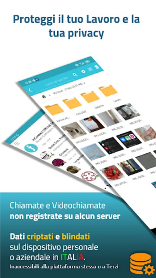 It is not a suite, but a single and direct channel that integrates the main functions for corporate communication and collaboration needs, based on P2P technology. Security is guaranteed by the most sophisticated forms of end-to-end encryption and by the presence of private access keys. Privacy is guaranteed with Calls and Video Calls not recorded on any server, chats and encrypted and armored files on your personal or company device, inaccessible to the platform itself or to third parties. ISO 27001 and GDPR certification.