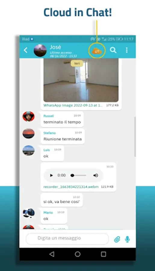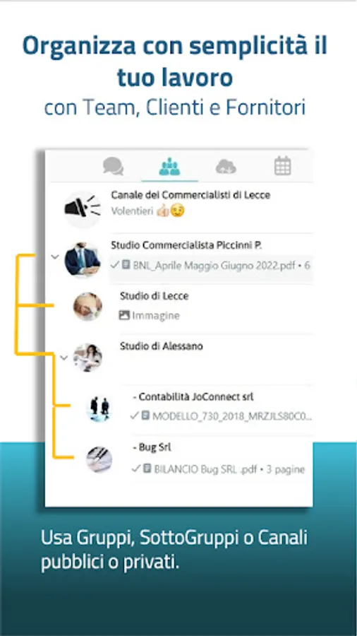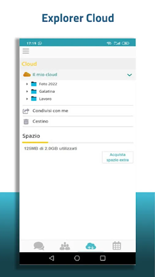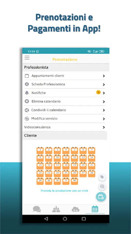 The Cloud is perfectly integrated into your chats, together with Groups and Subgroups. The Booking system allows you to perform online and face-to-face services and receive payments directly in the App!