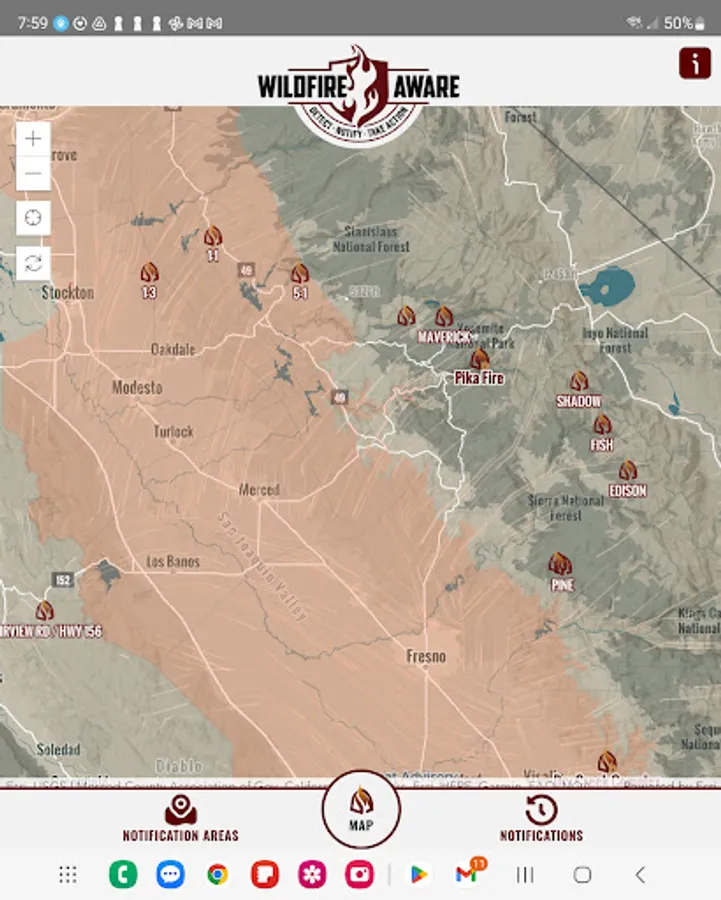 While alerting is the Premium Feature of Wildfire Aware, we also provide additional information within the map like the ALERTWest (which includes the ALERTCalifornia) camera network, detailed information about fires as it is updated, and the FIRIS (California Only) perimeters as they become available. We incorporated NASA VIRS and MODIS thermal hotspots, as well as NOAA HMS Fire Detections. Access to the map is provided for Free.