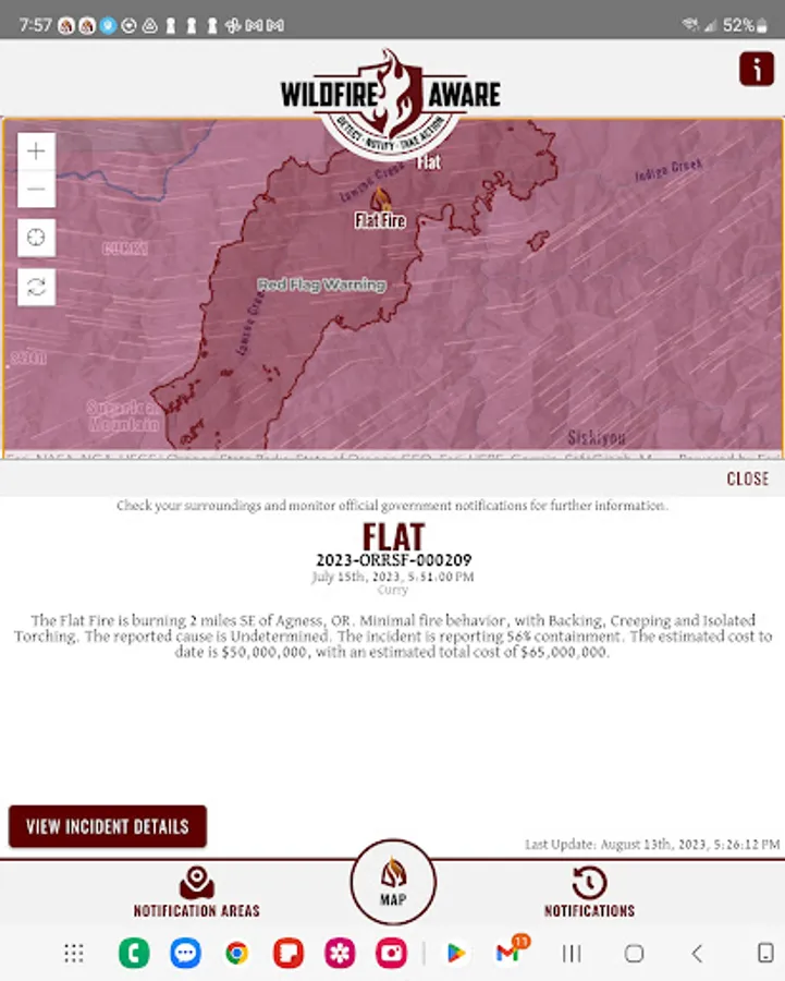 As fires burn for days or months, Wildfire Aware not only provides you notifications about perimeter updates but also provides authoritative supplemental agency data as well. Letting you know where the fire is. We source information from NIFC, IRWIN, InciWeb, CAL FIRE, US Forest Service (USFS), Bureau of Land Management (BLM), Department on Interior (DOI), and Texas A&M Forest Service, just to name a few.