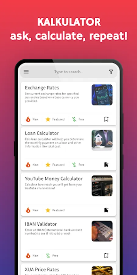 Kalkulator is an app that you can ask / kalkulate with and repeat as you need! Simply find a useful service for you, fill in the form and submit to see result. That's all!