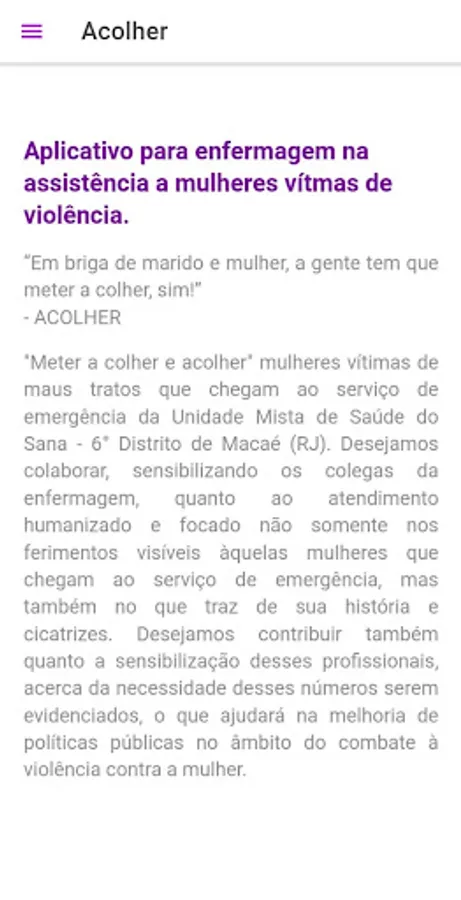 "Meter a spoon and shelter" women victims of abuse who arrive at the emergency service of the Mixed Health Unit of Sana - 6th District of Macaé (RJ). We wish to collaborate, sensitizing nursing colleagues about humanized care and focused not only on visible injuries to those women who arrive at the emergency service, but also on what they bring from their history and scars. We also want to contribute to the awareness of these professionals, about the need for these numbers to be highlighted, which will help to improve public policies in the context of combating violence against women.