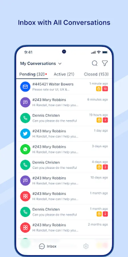 • Filter: Narrow down conversations with different criteria via inboxes, channels, departments, and phone numbers.